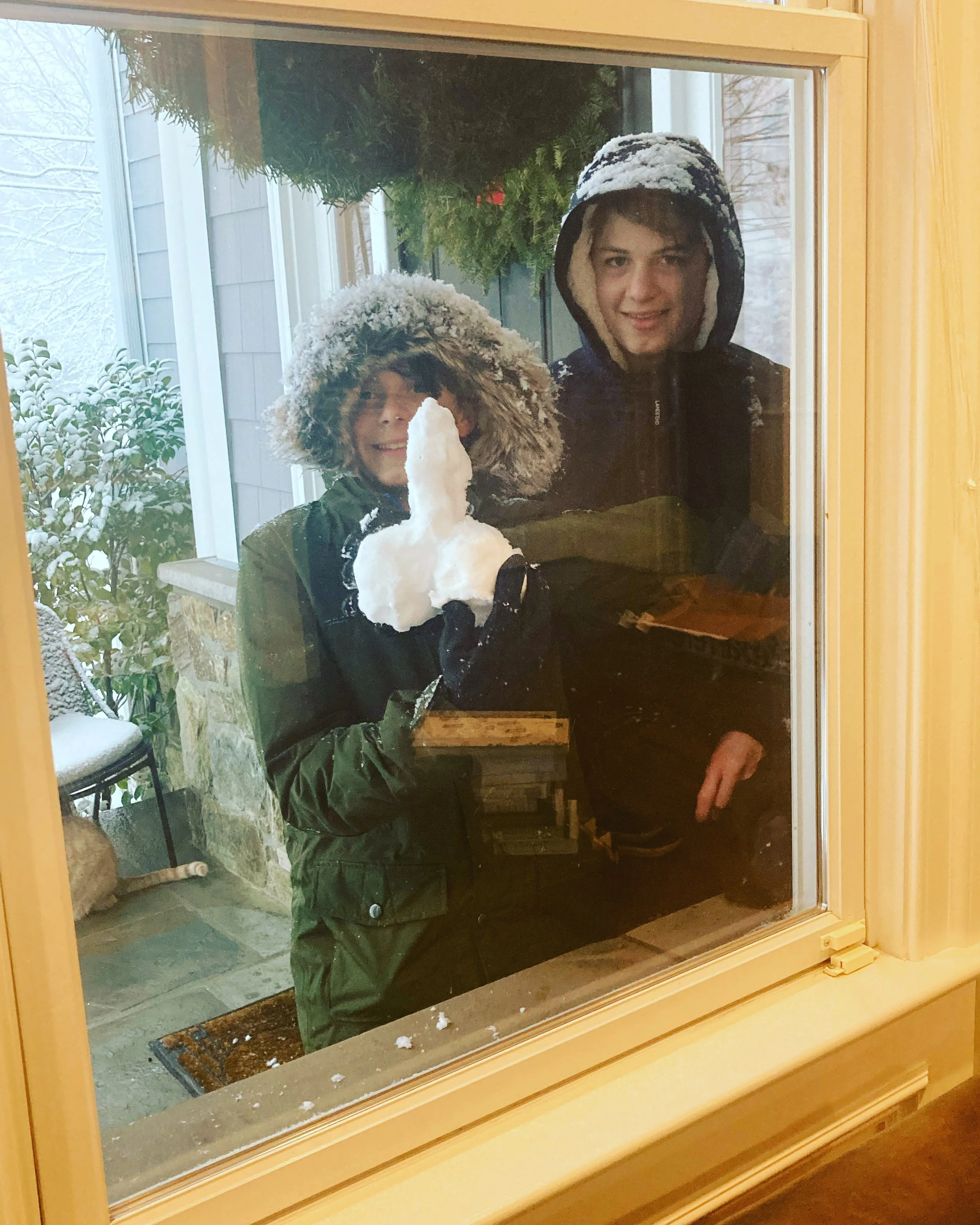 The kids bundled up, and raced out, and suddenly, interrupted from an “I can read now?” leap, there was a knock on the window and I looked up to this: