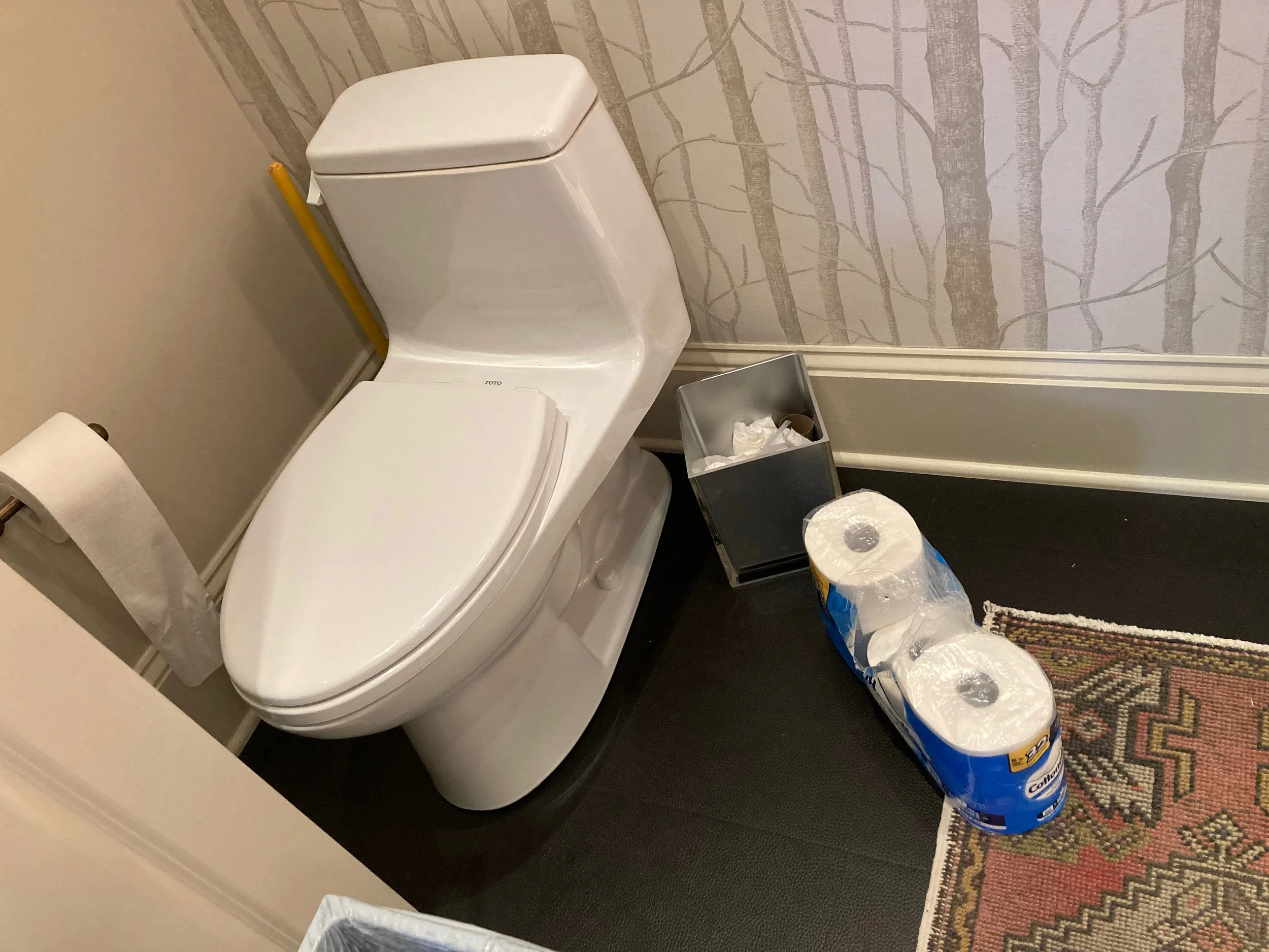 Points for recognizing that yes, you do need toilet paper after the other roll is used up, but A) the used roll does NOT (not pictured) need to be thrown under the vanity, not least because there is a garbage can RIGHT THERE, and B) how can difficult could it possibly be to put the tp package back into the vanity from whence YOU grabbed it, presumably while on the toilet?