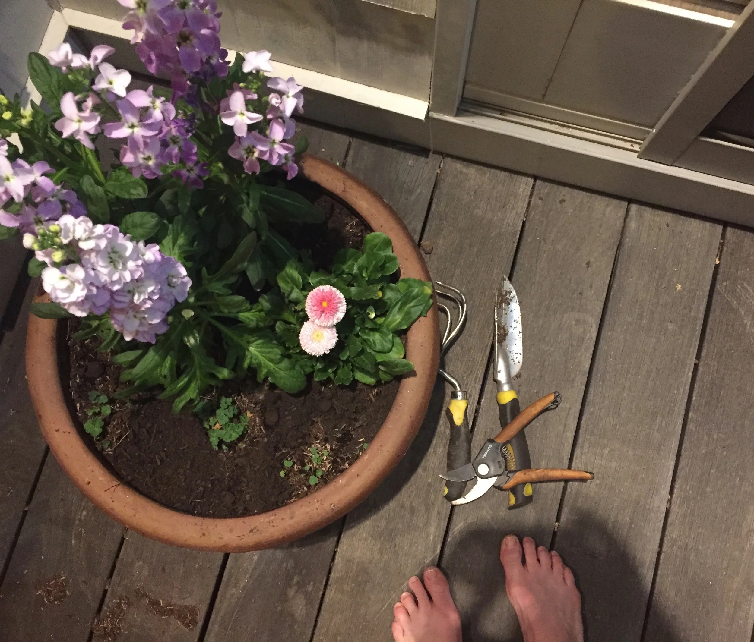 Despite my awareness that we're not yet past the possibility of a temperature dip into the frostly region, I went to the nursery for some herbs, arugula and flowers. Just a few things, just enough to keep the work needed to plant them in a reasonable realm, just enough to brighten the yard and start making it feel like ours. Just enough to sate my appetite.