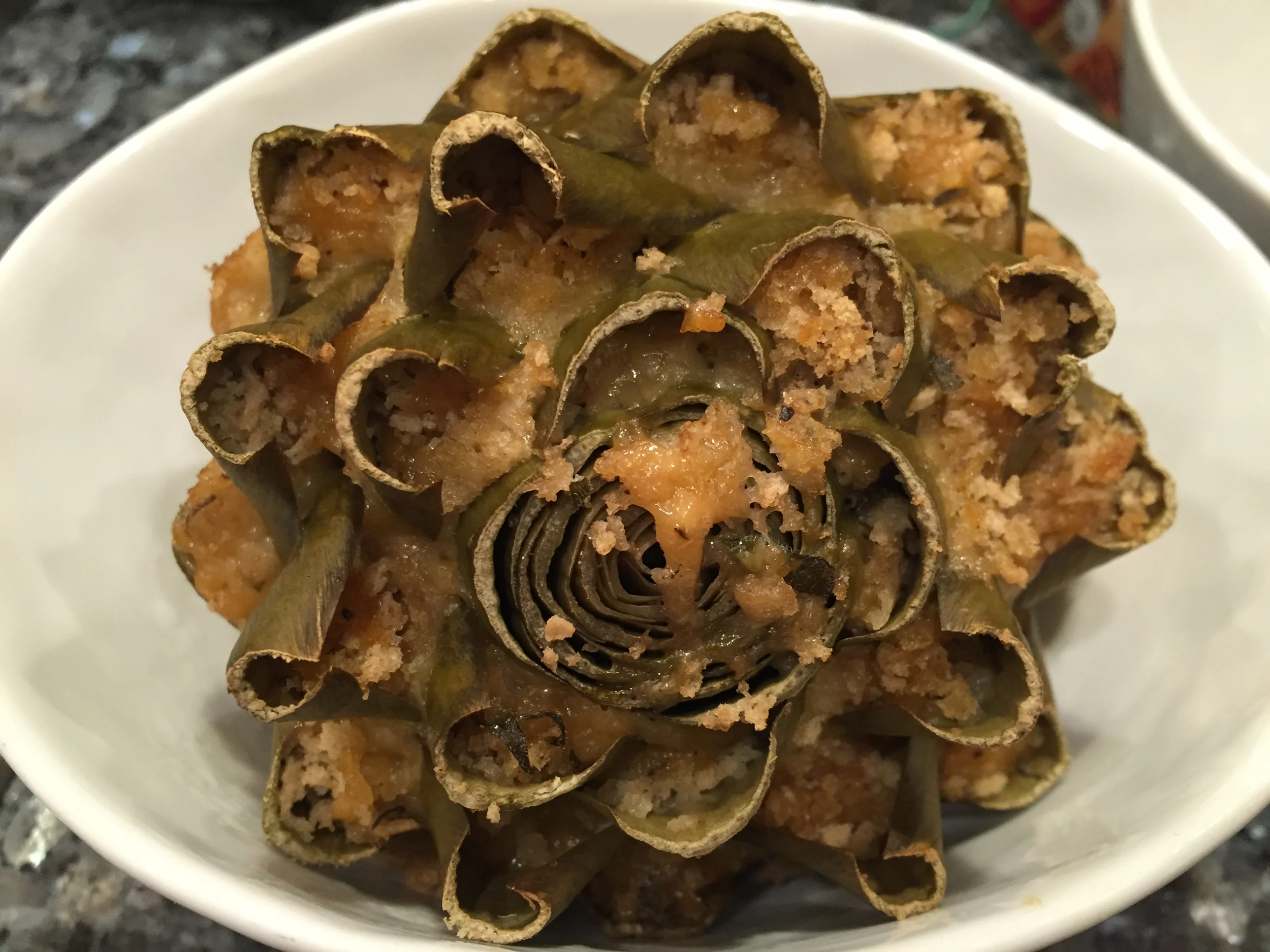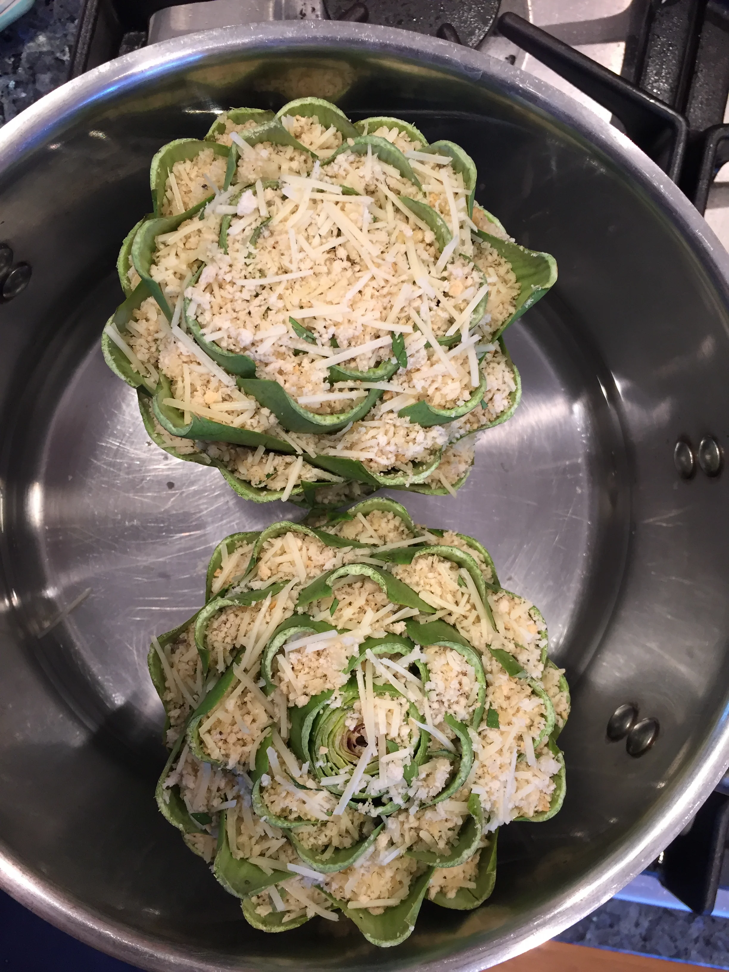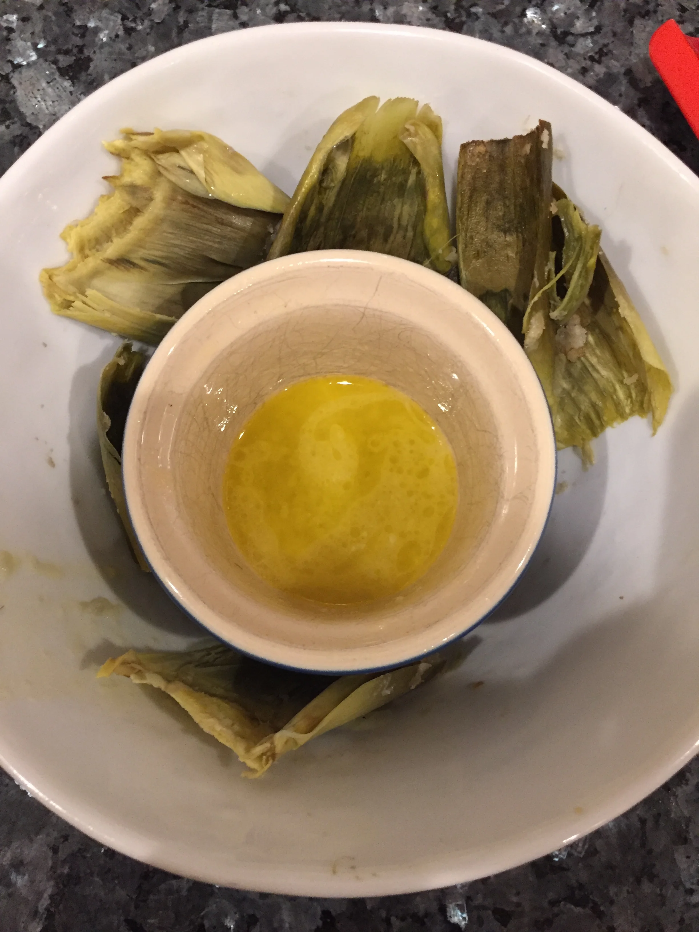 The water steamed away, the pot scalded, the sitter suggested I check, I got there just in time. More water, more steaming, more mulching and then happy-tired me served up the 'chokes. Tom and I each plucked a first leaf from the globe, turned it over so our bottom teeth could scrape off both stuffing and that tiny, miraculous mound of artichoke at the leaf's base, pulled gently and sighed deeply.