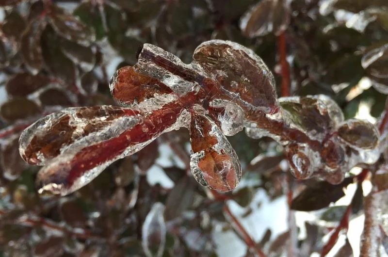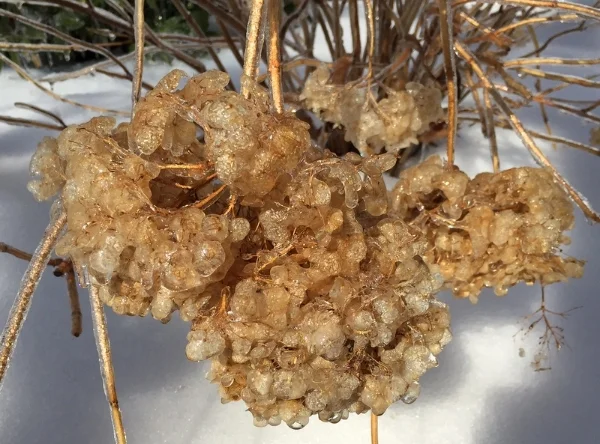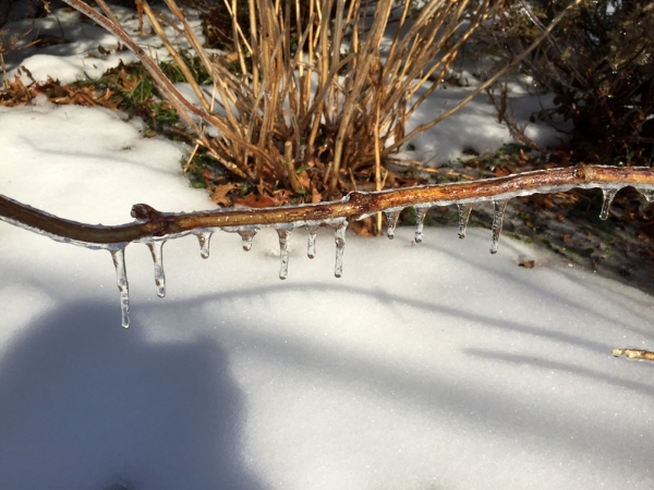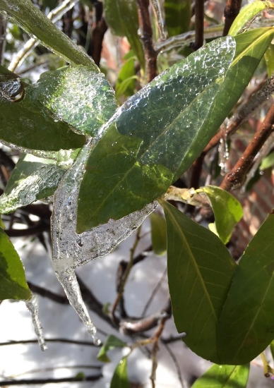 /School was delayed by two hours this morning, so the boys and I took a walk to explore all the ice storm had enveloped in its crystalline grip. Things were melting quickly, but we happened upon some amazing stuff: whole sheets of molded ice slipping off leaves and individual spears of grass; entire hydrangea heads enrobed; coated branches which looked like wands the White Witch might love. It was very beautiful and Is now, fortunately, very gone.