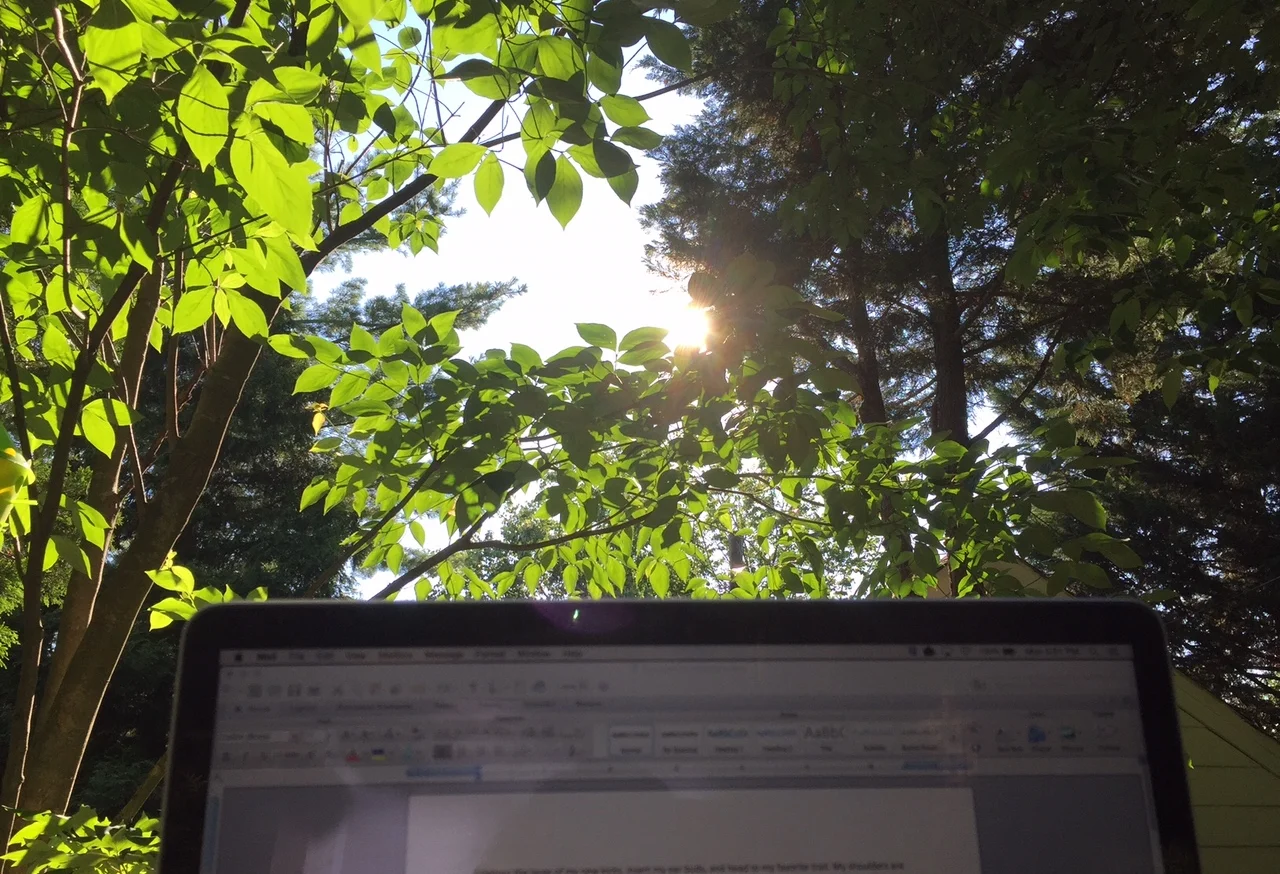 Right now, I'm spread out on it, legs in the sunshine, head conveniently in line with a dogwood branch that's blocking the rays aimed directly at my eyes. I'm writing. Or at least, I mean to be writing. I'm distracted, happily, by the various concerts being performed around me.