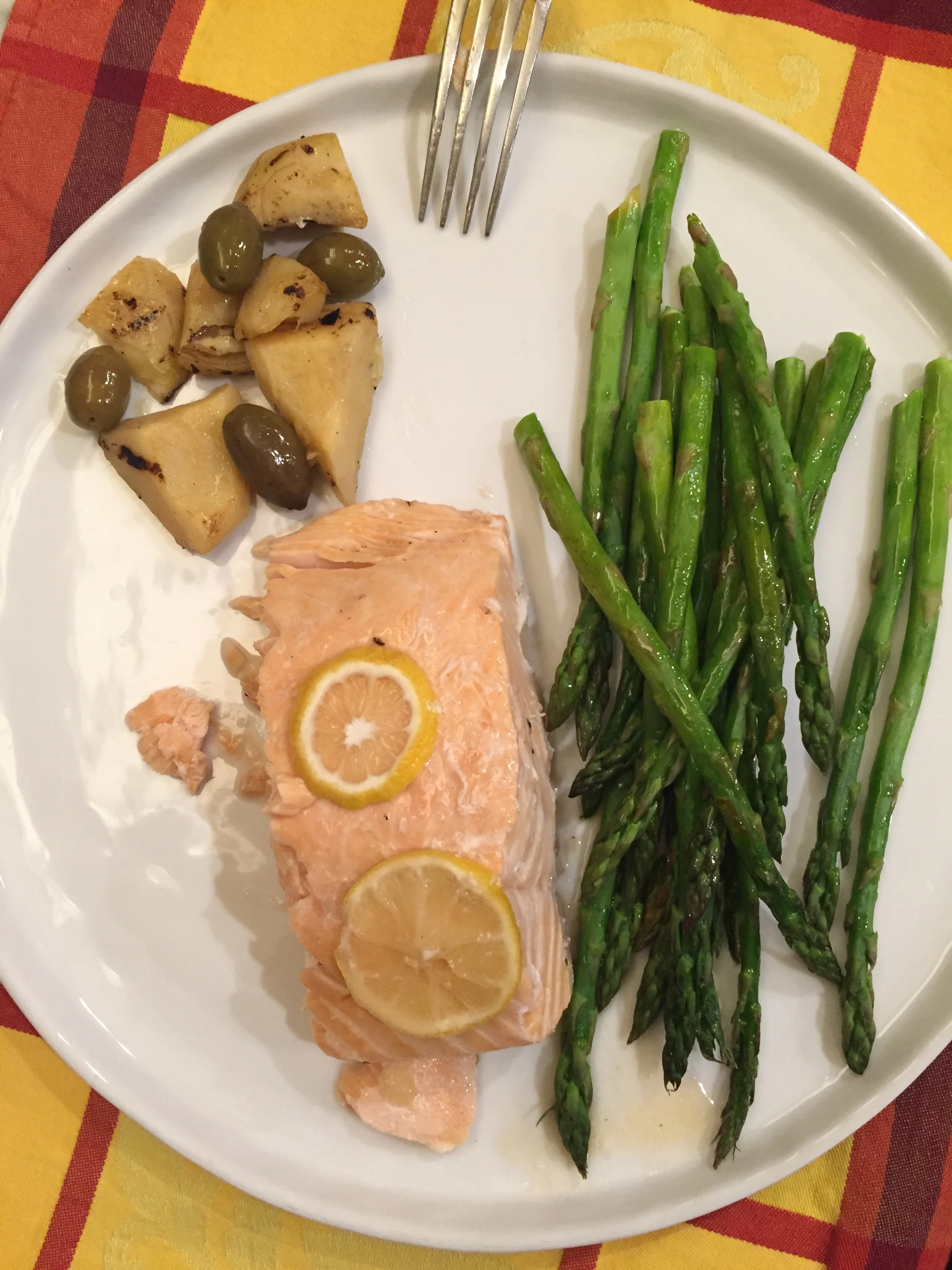 Do: cook your salmon with lemon, olives, grilled artichoke hearts, salt, and a pat of butter in a foil pack. Serve with asparagus, quickly roasted until just crisp-tender, generously dashed with olive oil, lemon juice, and salt. A healthy, easy, winner of a meal.