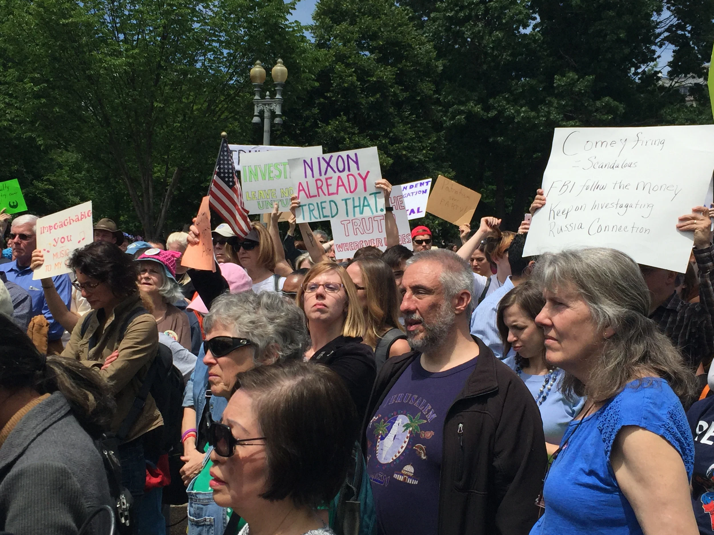 Mom, who is here for both boys' Grandparents' Days, and I were so pissed after last night's sudden firing of Comey (of whom neither of us are even fans, but come on!) that we decided to head downtown for today's "Comey Fired protest" quickly organized by MoveOn and many others.