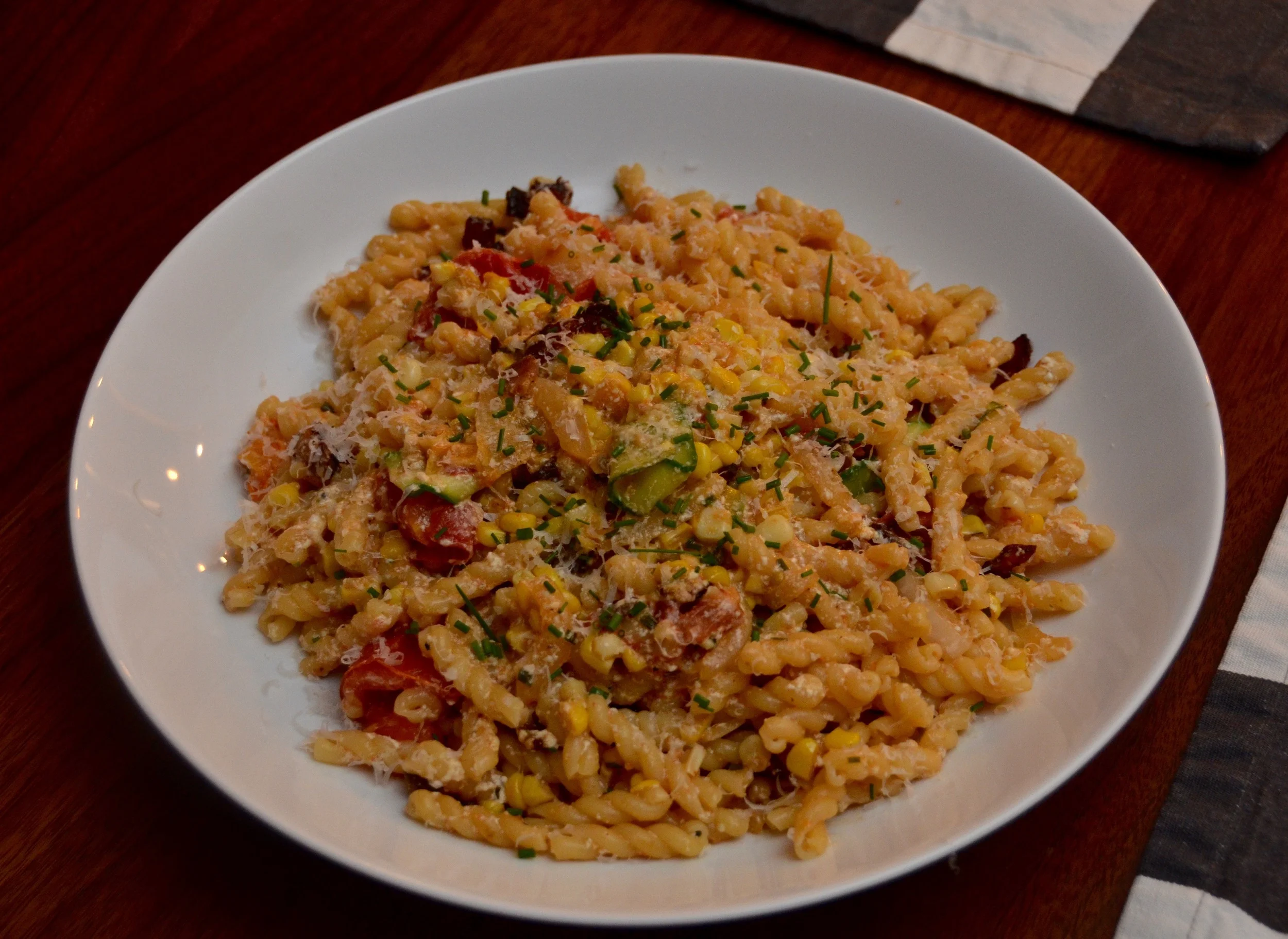 Well, my interpretation anyway: corn, tomatoes, zucchini, chives, homemade ricotta, vidalia onions. Delicious.