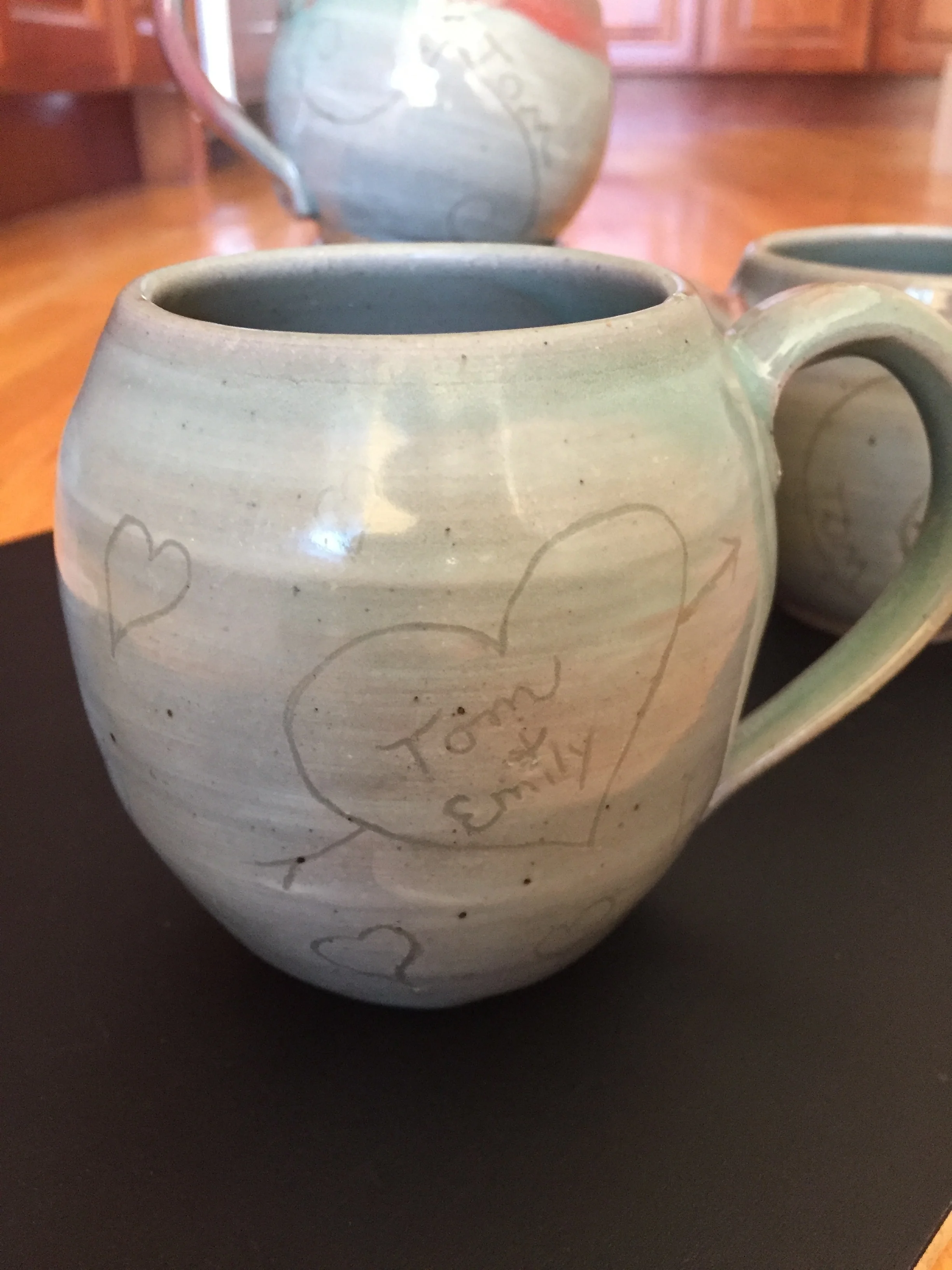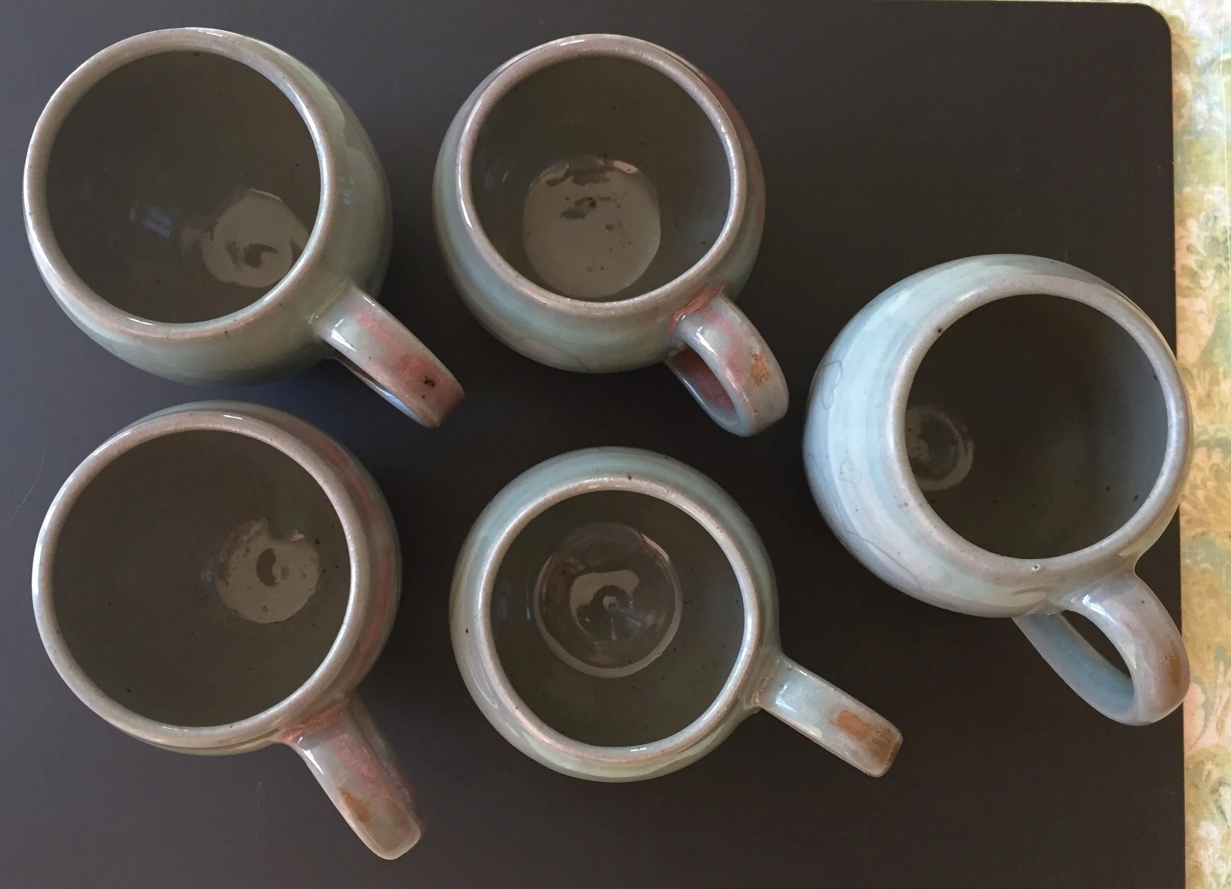 Jim and Marjorie, Emily's parents are accomplished artists (sculpture, pottery, painting, wine-making), and for our wedding gift made Tom and me a set of five mugs. The glaze is an inviting bluish green -think celadon + seafoam- with a hint of red in spots near the mugs' rim. Each cup is unique but thematically on point.