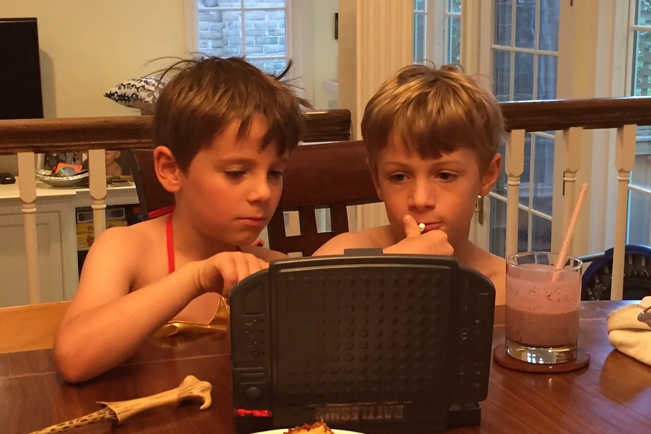 Nor is it all that feasible. I don't know many parents whose kids truly entertain themselves for hours on end, even if they're allowed to go full zombie with a screen. Something will run out of batteries, someone will fall, a fight over Legos will surely ensue, never-ending hunger will need to be fed. Likewise, I'm an at-home parent for a reason: to stew in the wonder of loving, tending, guiding and remembering. And, apparently, to be beaten in Battleship by these two kiddos.