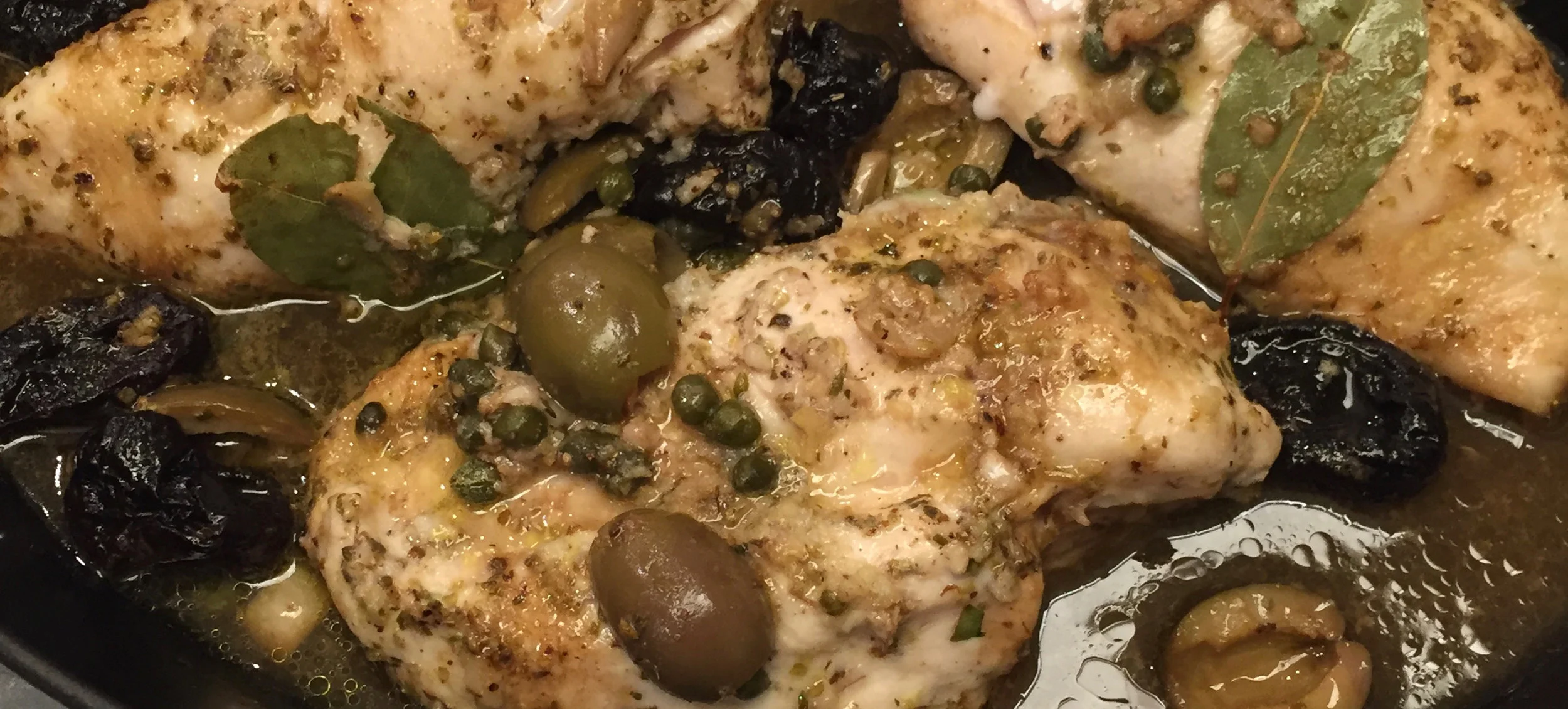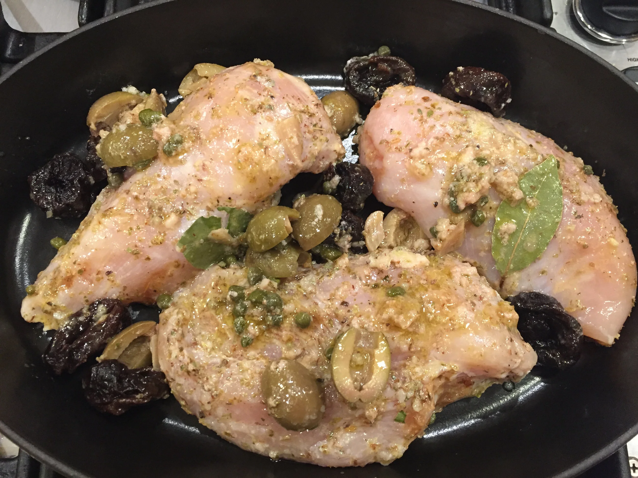 Have y'all ever had this dish? My aunt Wendy used to make it regularly (or what seemed like regularly to me), and I always adored it. The chicken and prunes, wine and olives, bay leaves and garlic, capers and brown sugar all meld together in such a savory, pleasurable way. Mamma mia!