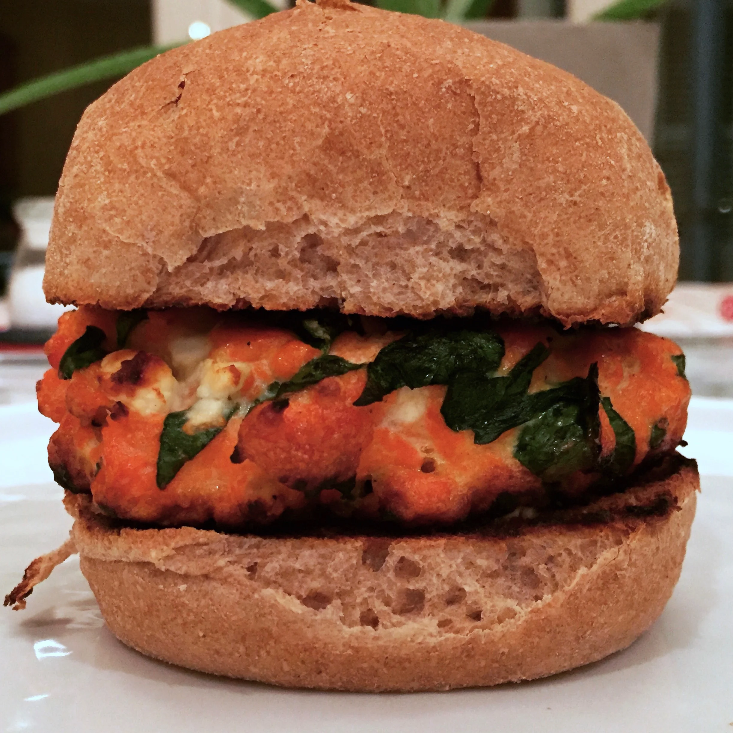 Salmon and spinach burgers with feta, amazing Brussels sprouts