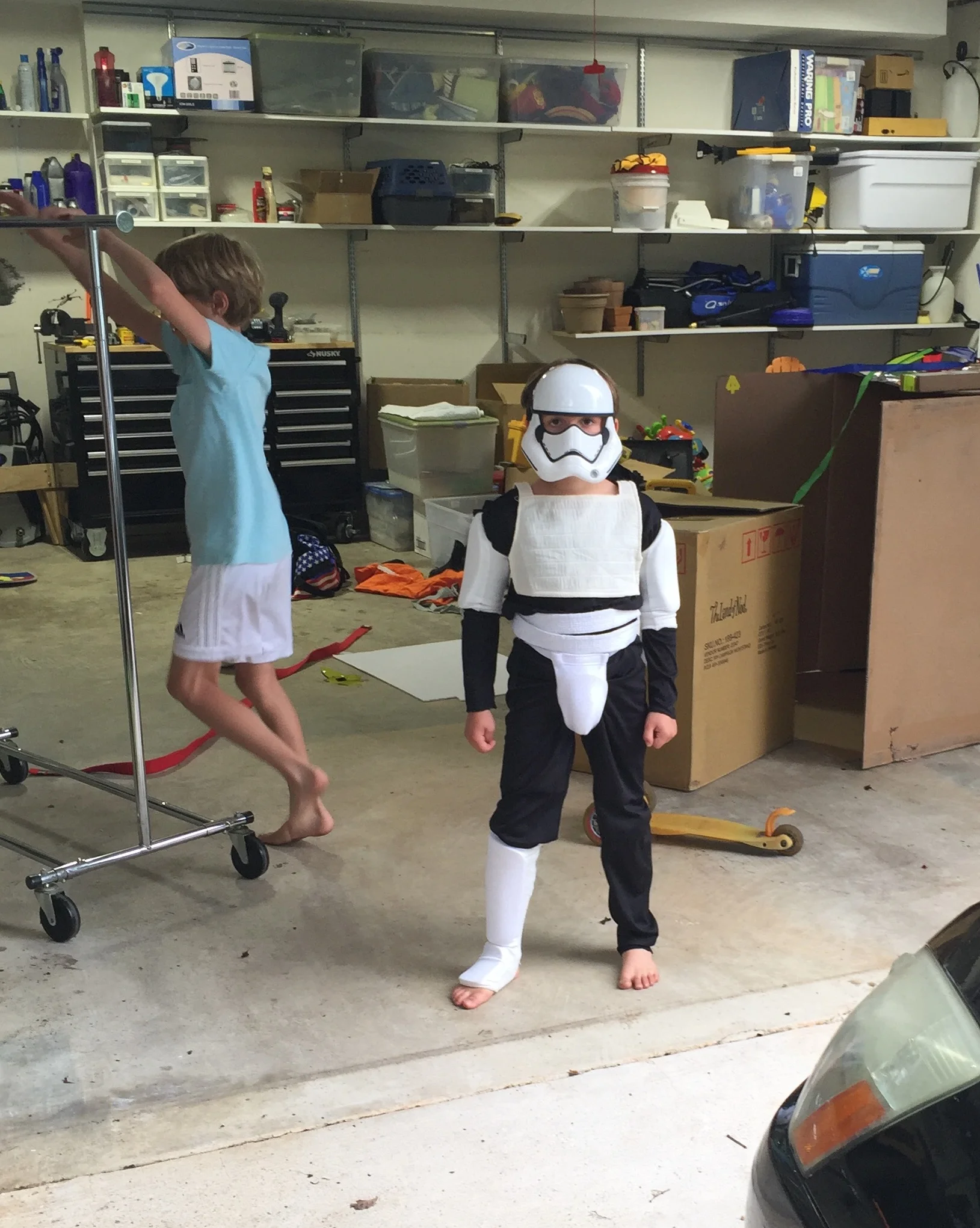 I returned home to this masterpiece, a delightful repurposing of ninja wear, old Tae Kwon Do gear, a Rebel pilot bib, and the storm trooper mask we already owned.