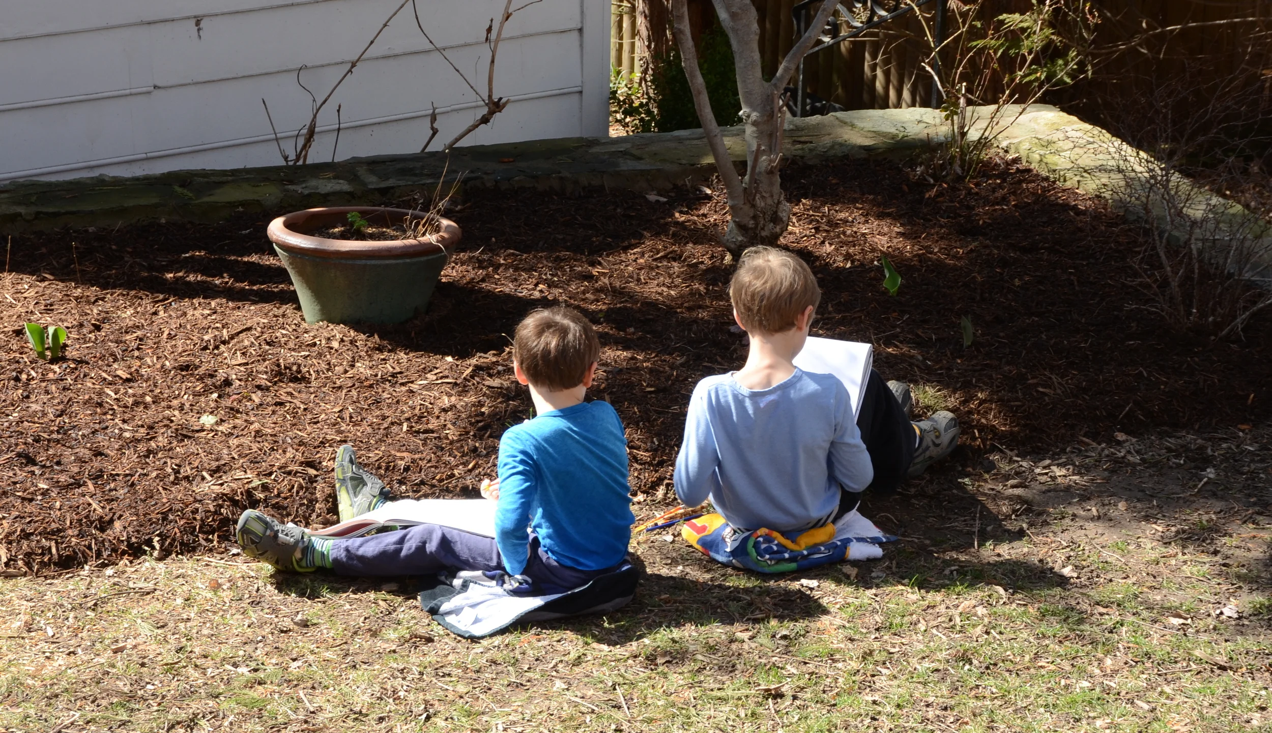 Nearly struck dumb by the beauty of sunlight glowing through a crocus's lavender petals, I told the boys to grab drawing pads and colored pencils and try their hands at memorializing the scene. I put towels down so the damp ground wouldn't soak their bums, and draw they did. I  took art for years as a child and am so happy that my boys love it too.