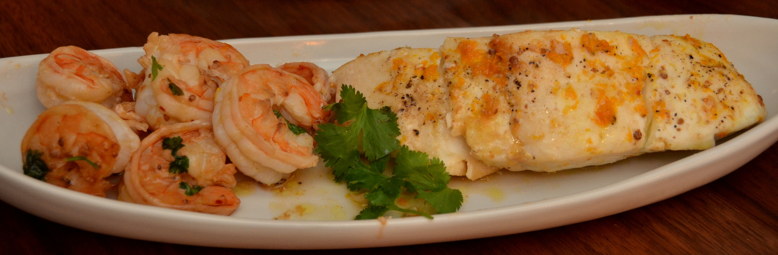 Tonight, more halibut plus shrimp. T made a quick marinade of red pepper flakes, orange, coriander, olive oil, lemon and salt, and we tossed everything together, pan-roasted it and topped with cilantro. Satisfying.