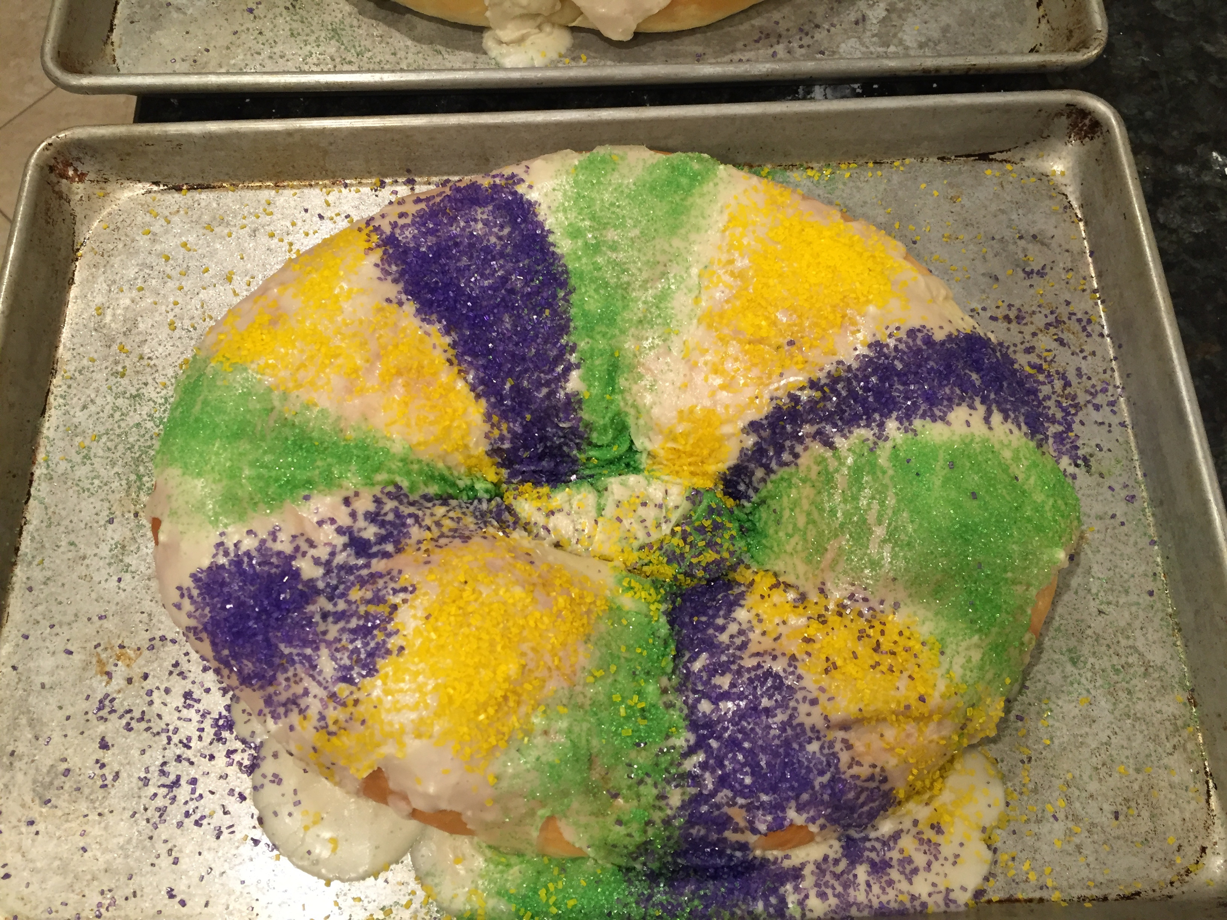 For the first time, I've added a plastic baby to each cake, comfortable that all the kids are old enough now not to freak out if they cut or bite into a naked infant. Louisiana folks take such knowledge for granted, but I have long wondered if a child who's unfamiliar with the king cake tradition might be traumatized with such a surprise in his or her cake.