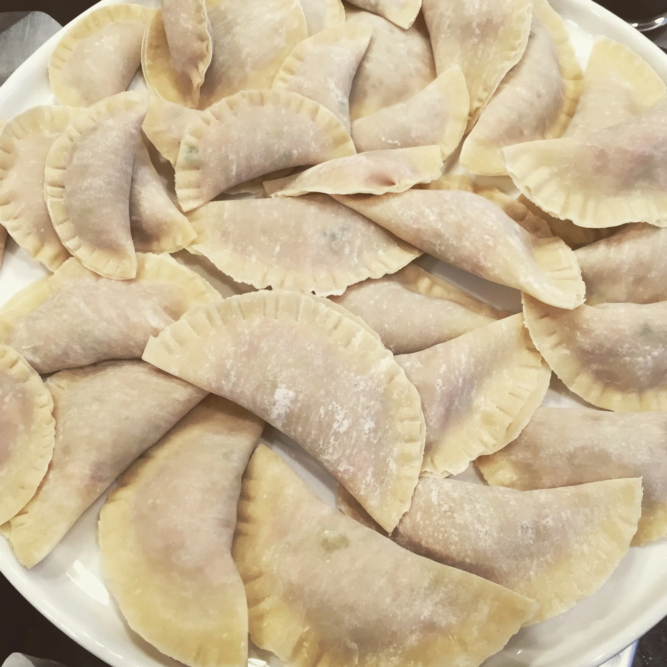 To celebrate the Lunar New Year (last Saturday) and welcome the Year of the Rooster, and also because Jack is finally exiting his phase of mind-numbingly dull eating and has discovered a mad passion for pork dumplings, I made, wait for it, many pork dumplings yesterday.* Oliver and his sweet hands were huge helps in the folding and crimping department, and we crafted about sixty half-moons in no time flat.