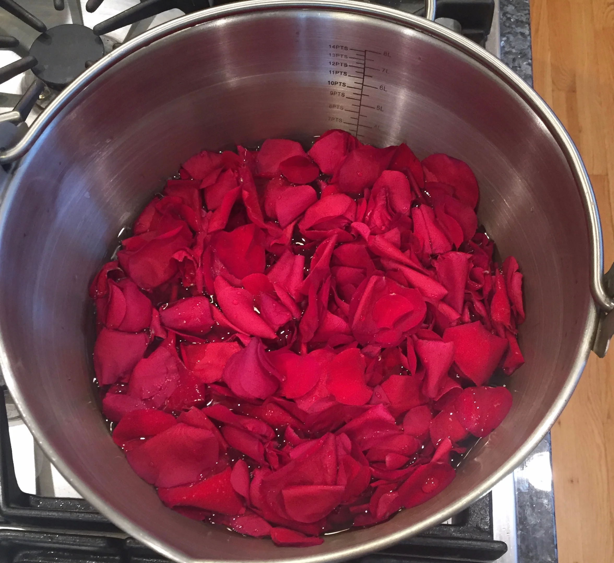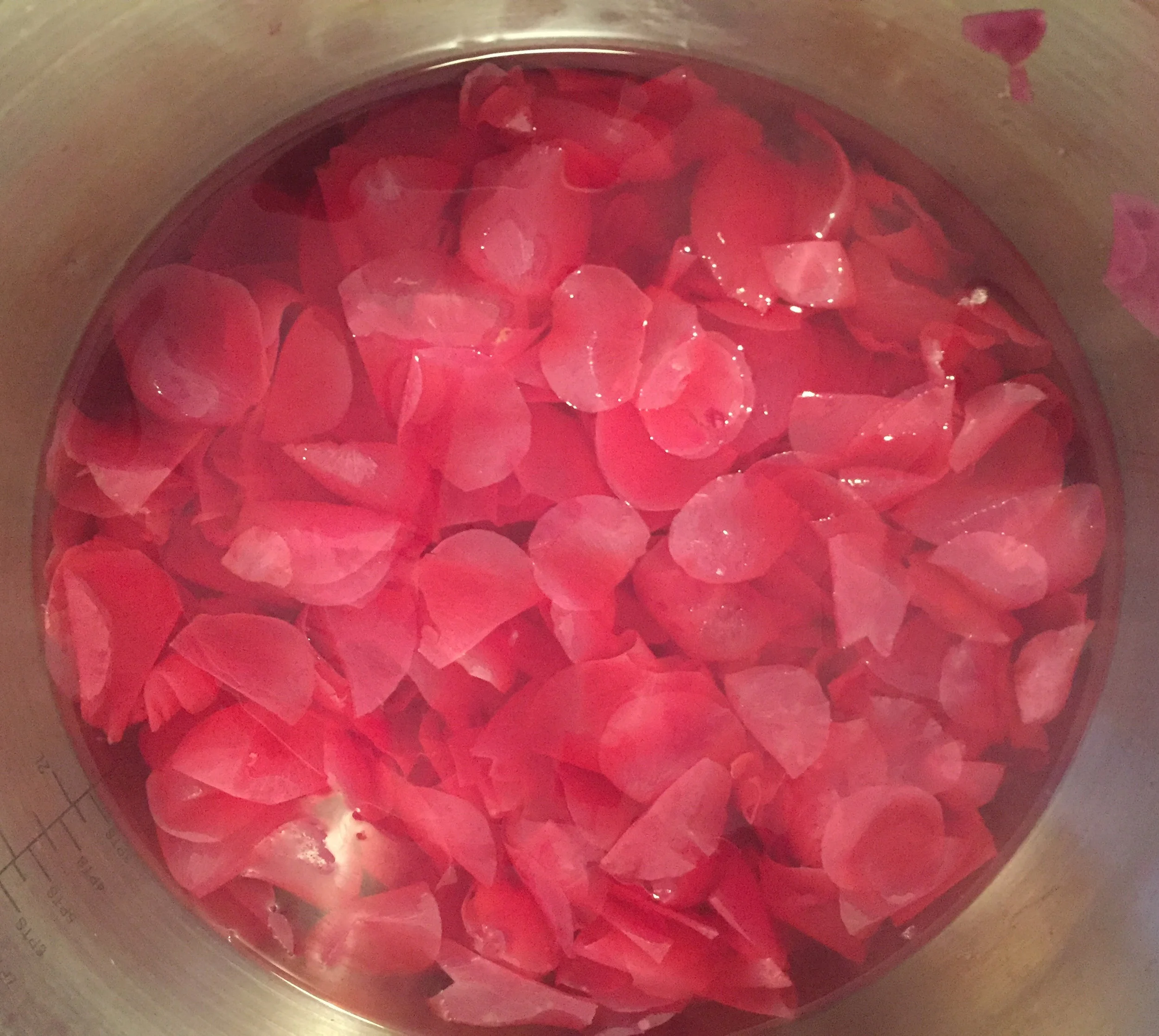 I doubled the recipe since I received 24 stems this year but came to find that I only had one envelope of liquid pectin. Alas, I now have loose jelly. But it still sings with the unique taste of rose, a taste that becomes really magical atop lemon curd and warm bread; that is my favorite way to eat this jelly.