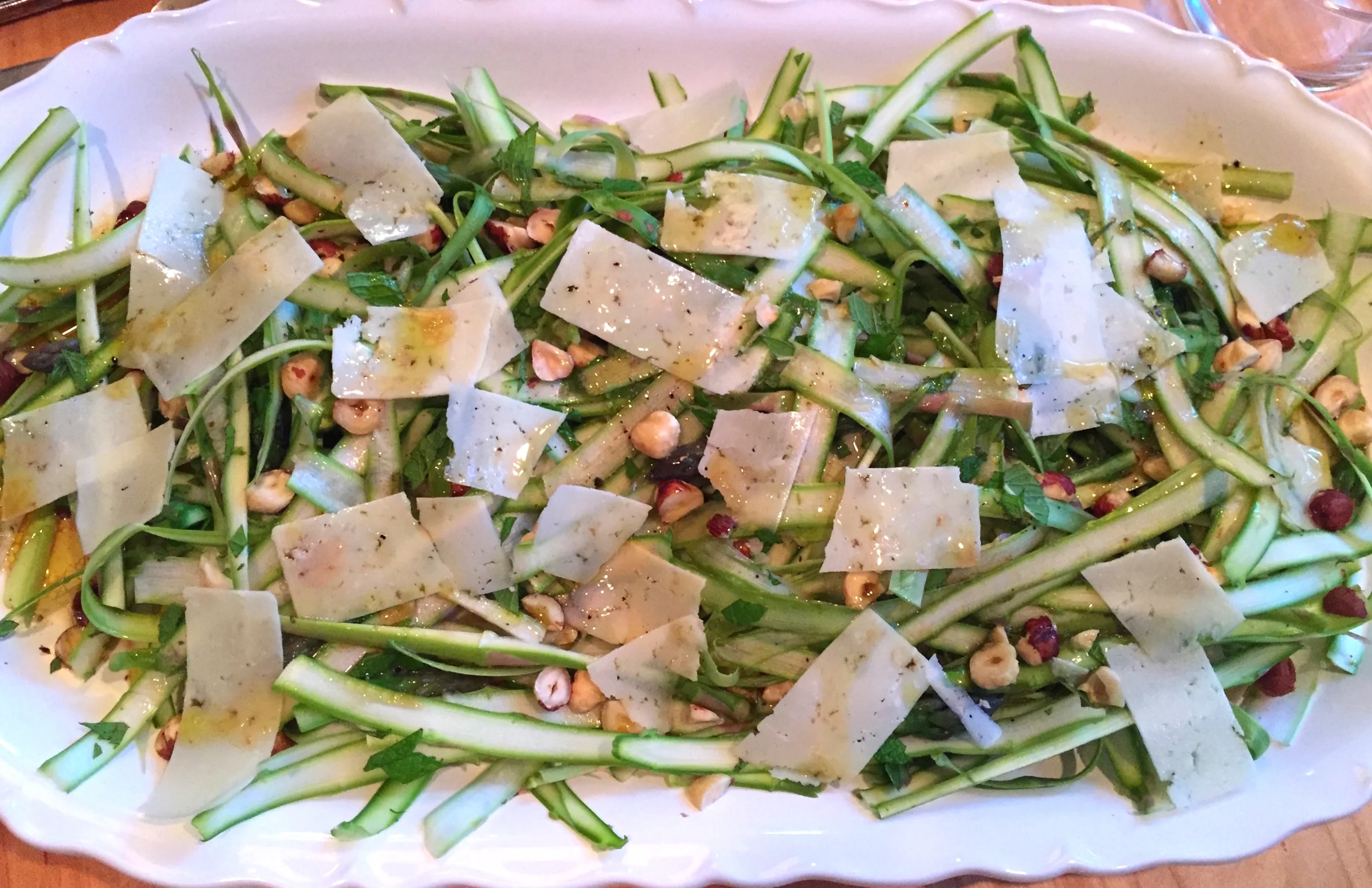 Last night, I attended the first get-together of a supper club I was asked to join. The theme was Spring. I decided to make a shaved asparagus salad with hazelnuts, mint and pecorino, with some of the asparagus I bought on Sunday morning at the farmers market.