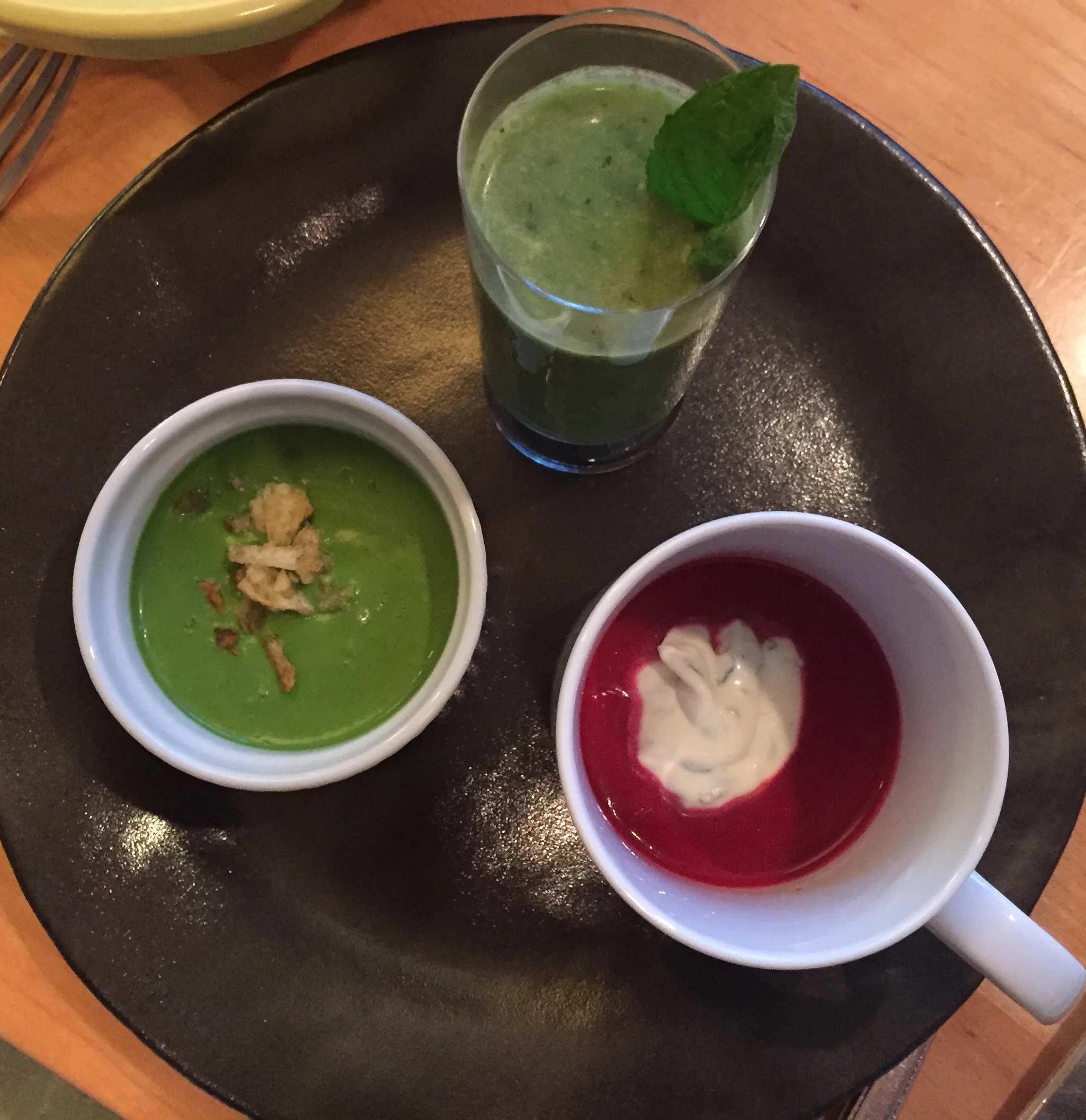 a trio of soups: green; minty pea; beet-carrot with lime-parsley creme