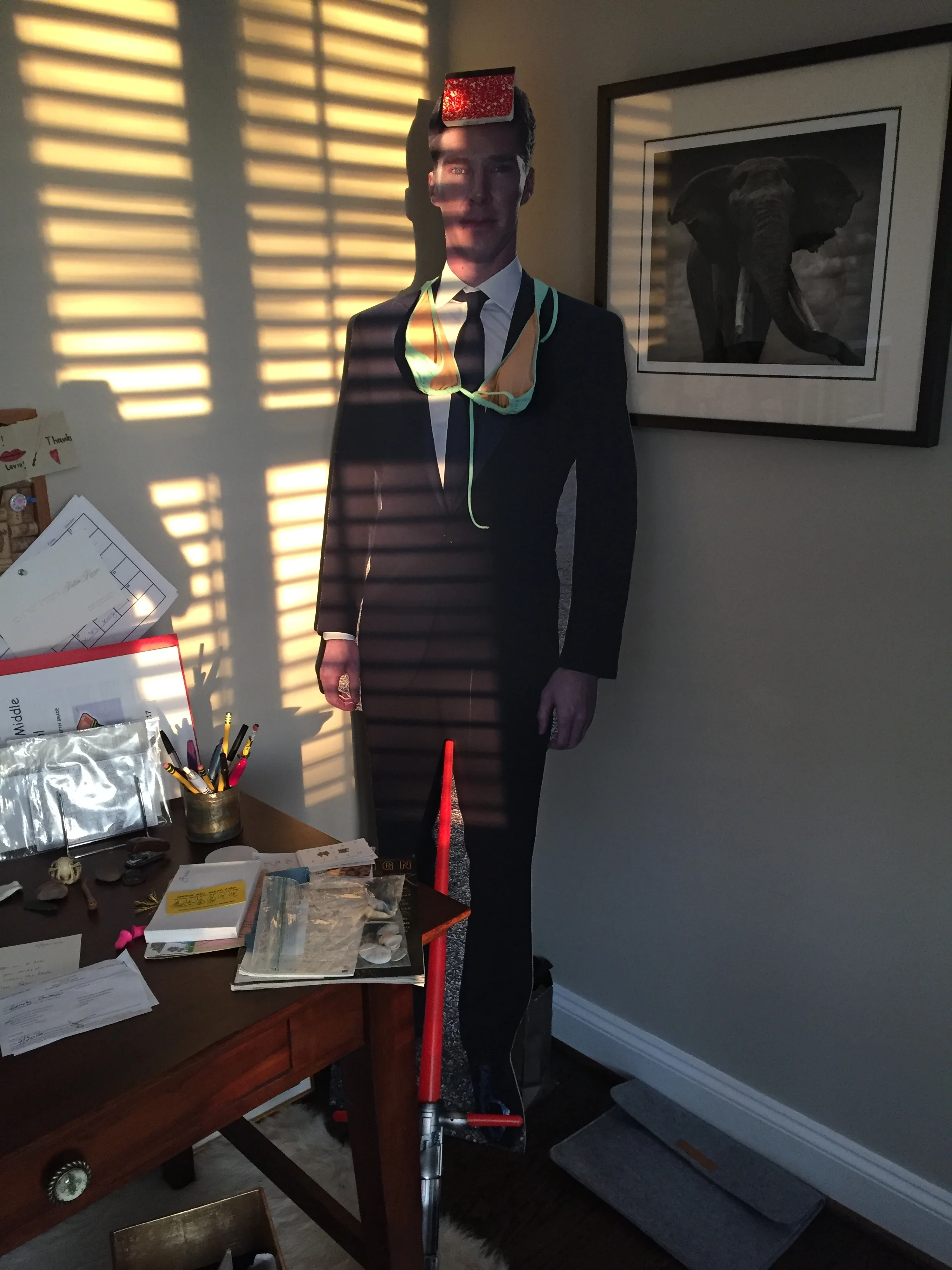 I found clothes hanging from my closet light, 97 stuffed animals thrown over the stair balcony, Legos everywhere, and this.