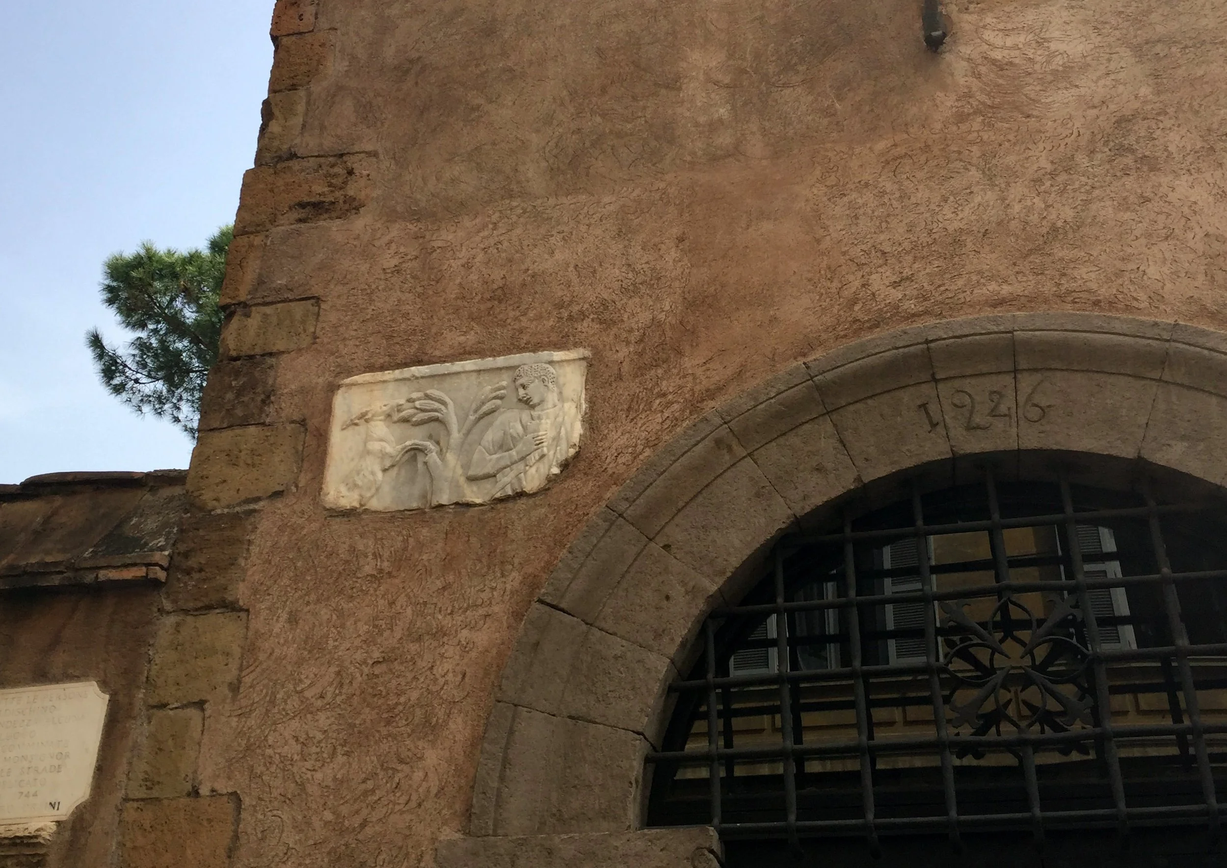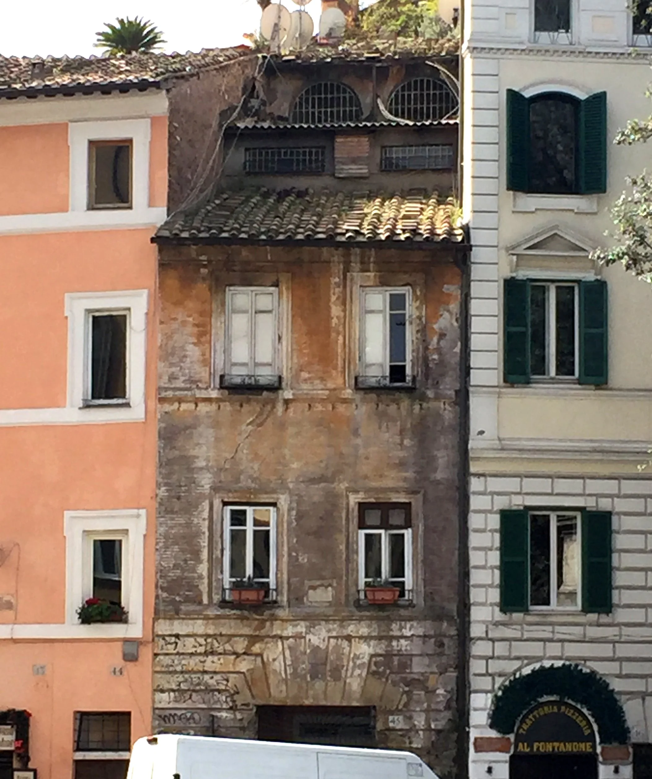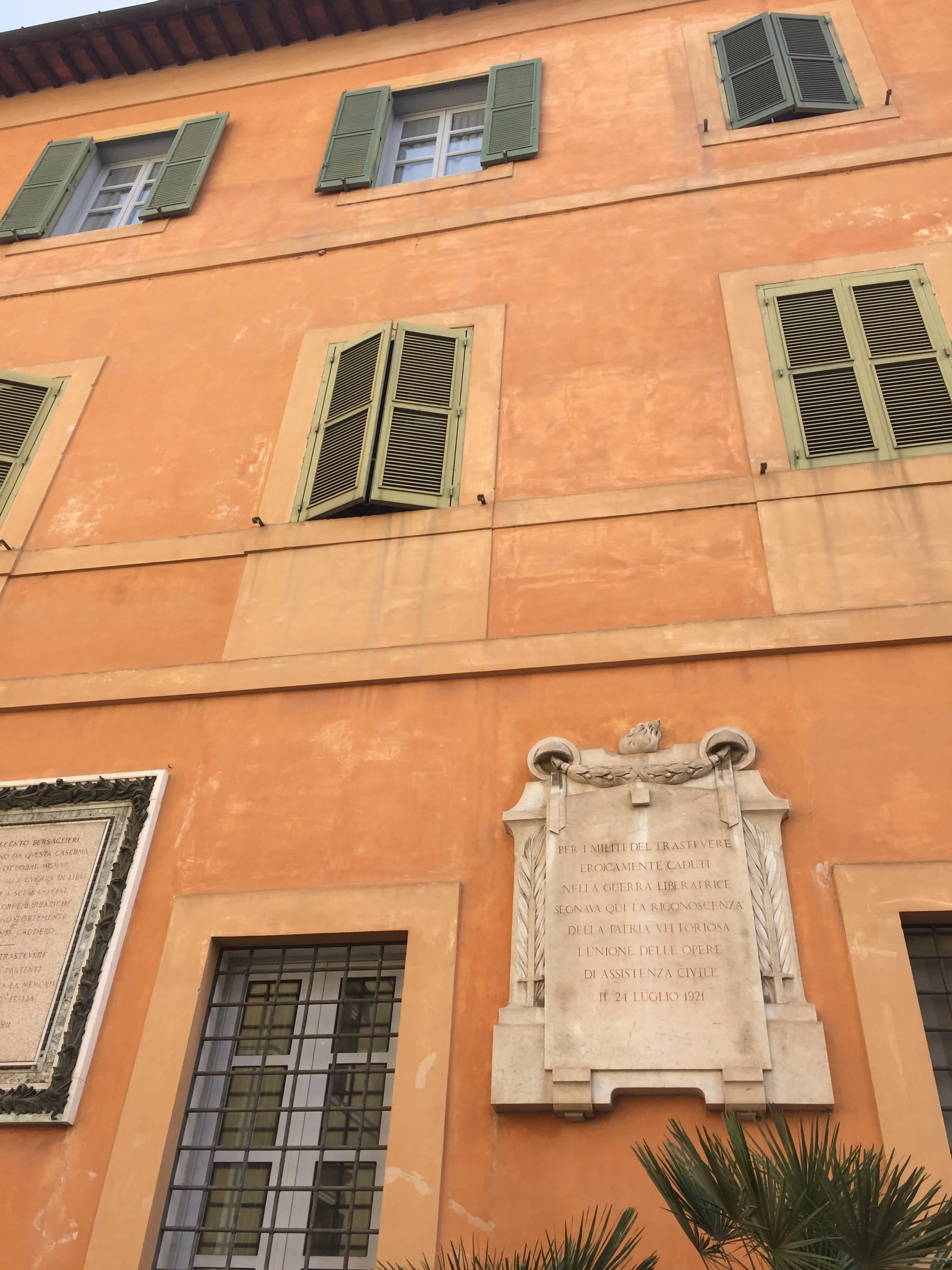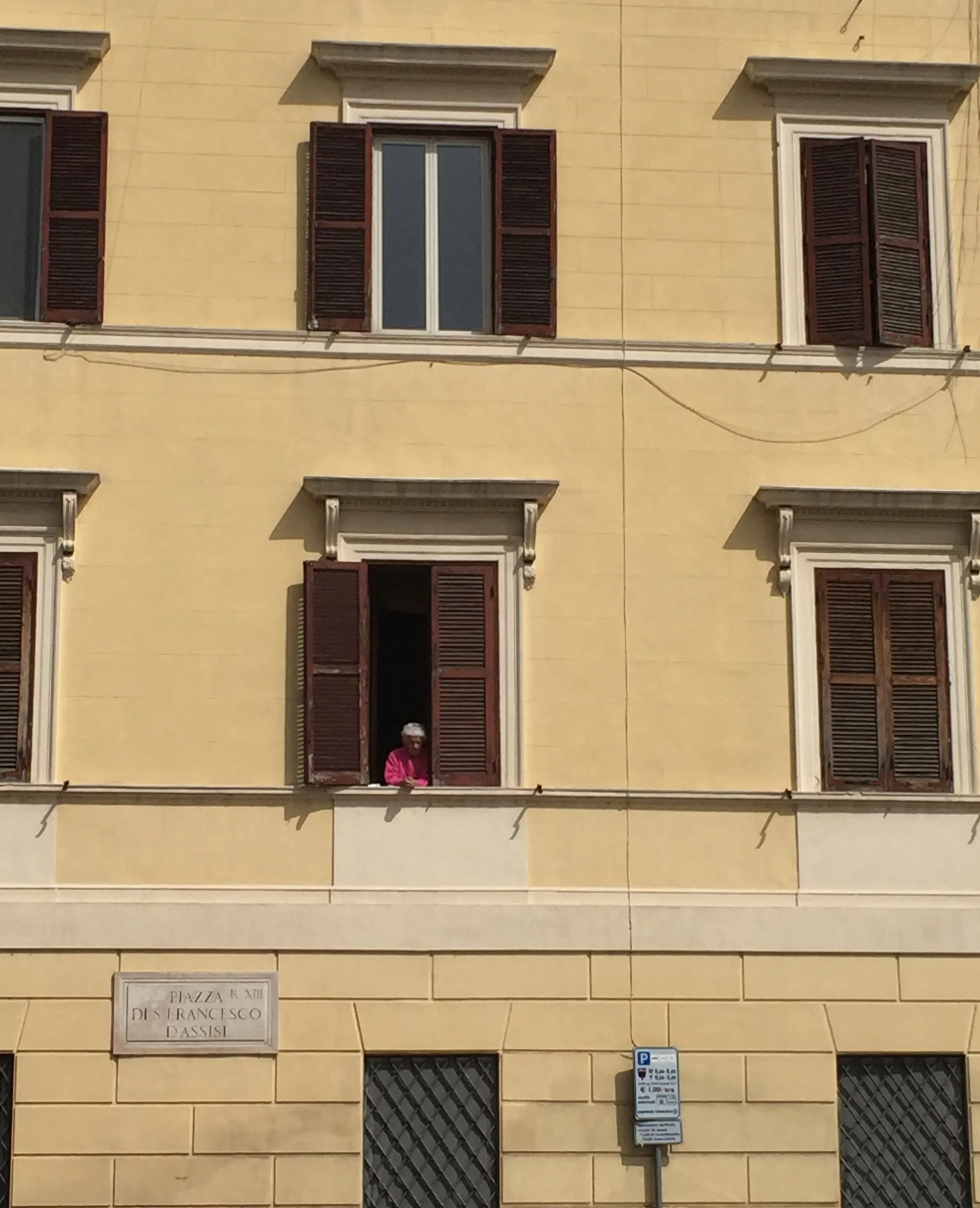 An elderly woman watches out over a Trastevere piazza. I love her pink shawl.