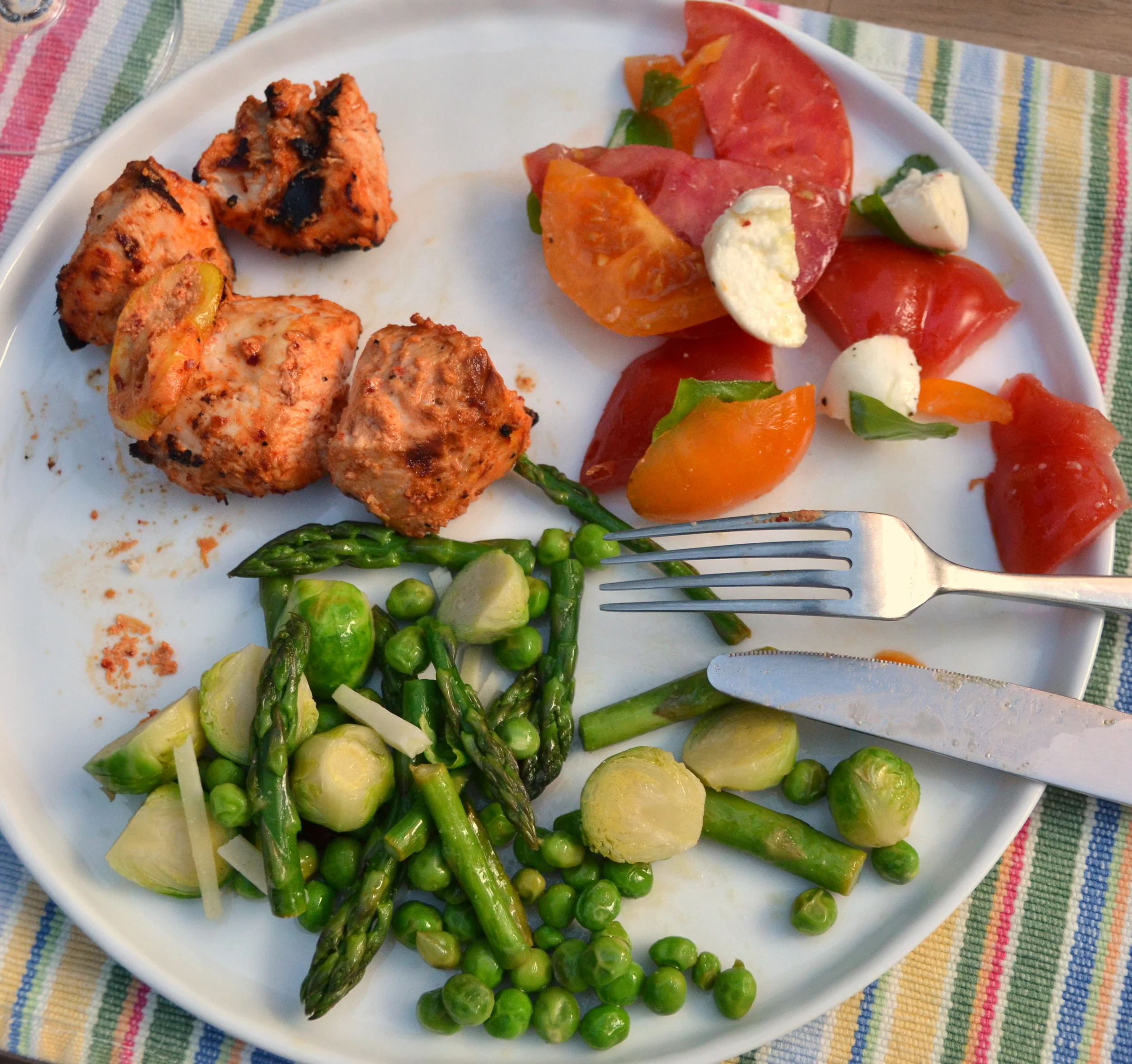 yogurt chicken with aleppo and lemon, caprese salad, sauteed asparagus/english peas/Brussels sprouts and pecorino