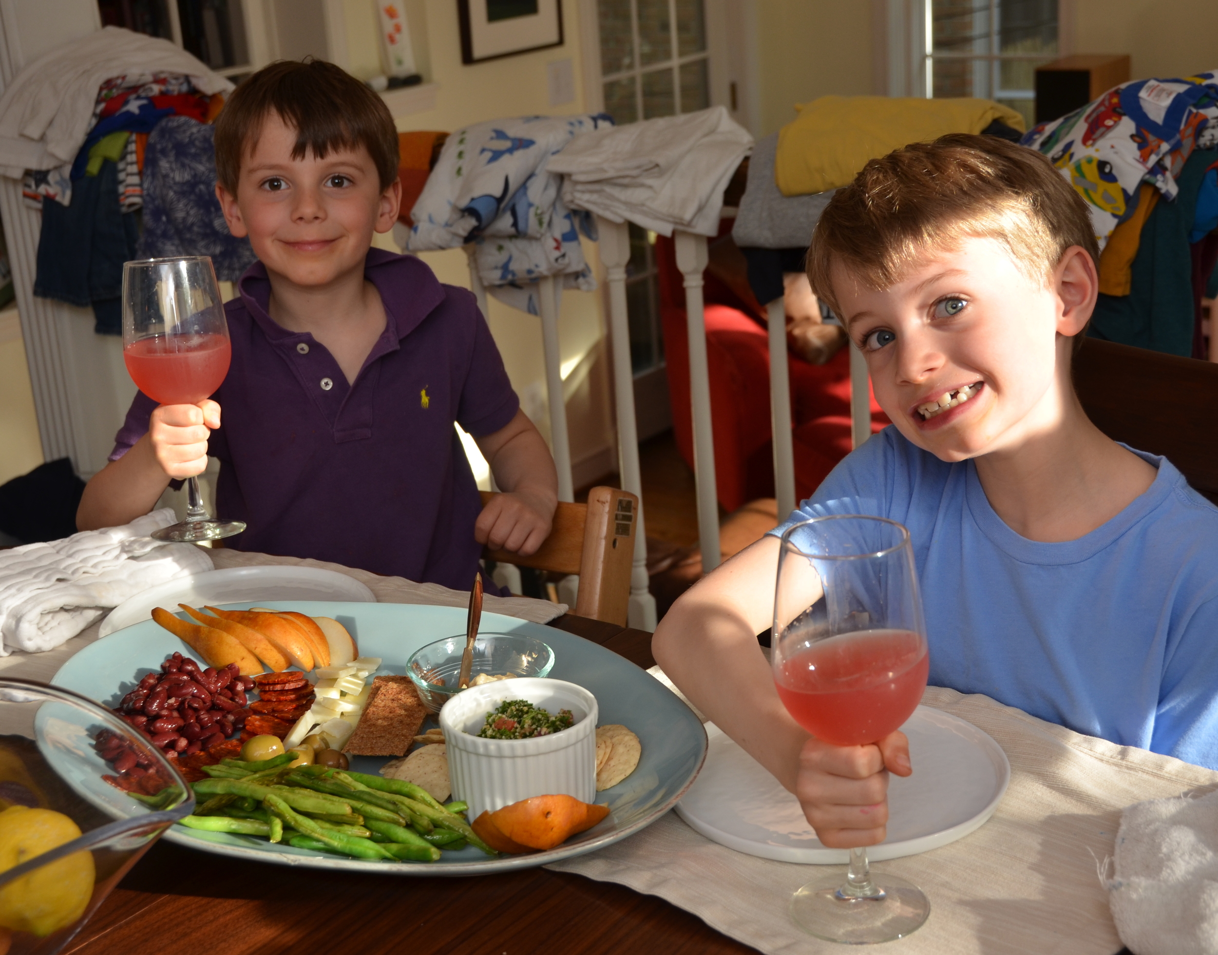 Friday night antipasto dinner with strawberry lemonade in wine glasses. Festive!