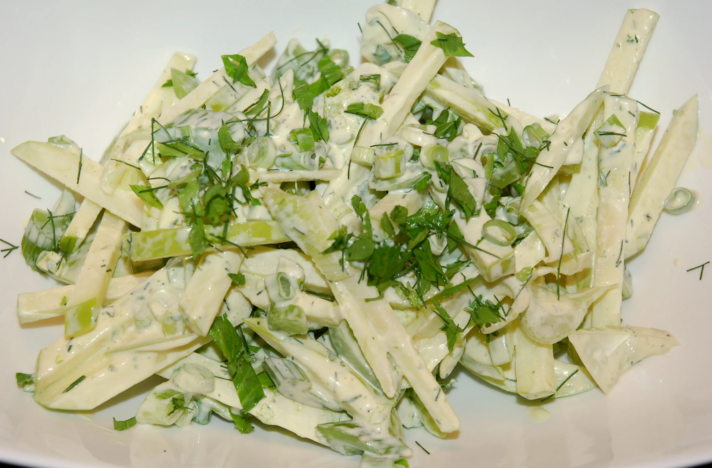 /Summary: I've never been a coleslaw fan, but I do like the idea of thinly sliced veggies in a tangy, creamy dressing. The crisp, crunchy freshness of Granny Smith apples, celery and fennel is infinitely pleasing, especially when dressed with a refreshing aioli infused with celery leaves and fennel fronds. This is a great summer salad; hearty enough to be a simple lunch when paired with some great bread and/or some grilled shrimp, or a terrific start to dinner on the patio.