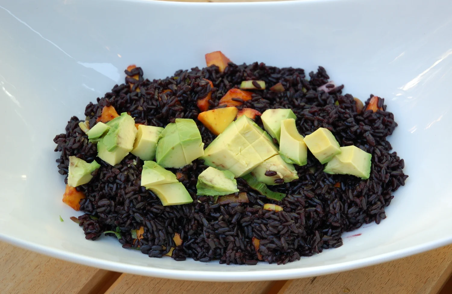 /Summary: The creamy, nutty texture of the black rice pairs so nicely with chopped mango, scallions, avocado and a lime-serrano-rice wine vinaigrette!
