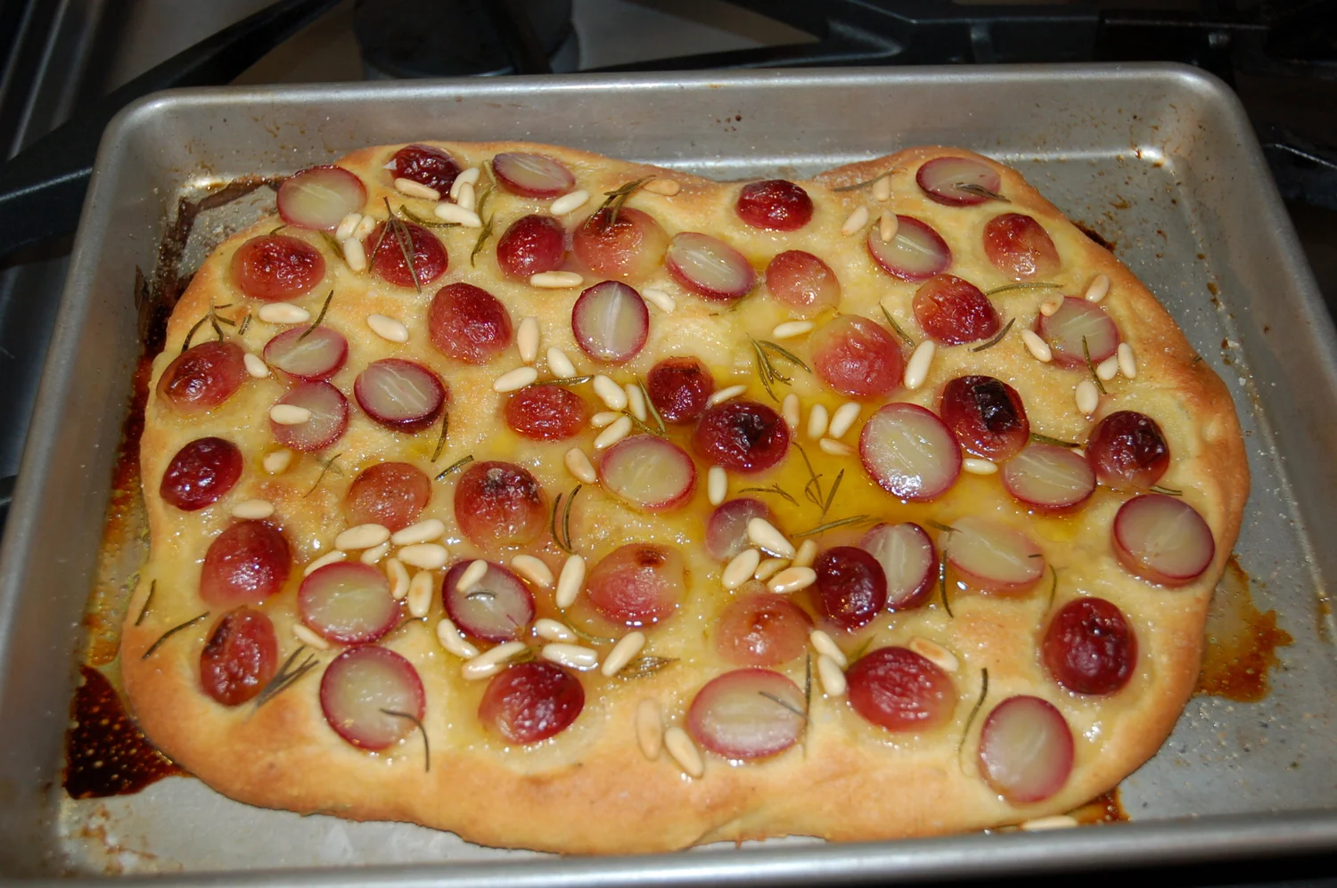 /Summary: Known as schiacciata con l'uva in Italian, this is a terrific, unique flatbread cooked with rosemary, grapes, pine nuts and olive oil. I obtained this recipe from the 9/28/11 NYTimes Dining section; Melissa Clark is its author. You can halve this recipe.