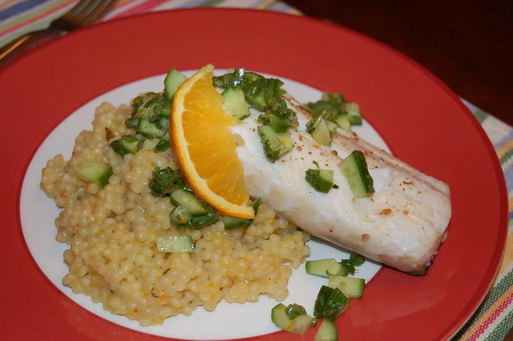 Halibut with Herb-Citrus Salsa and Israeli Couscous Risotto
