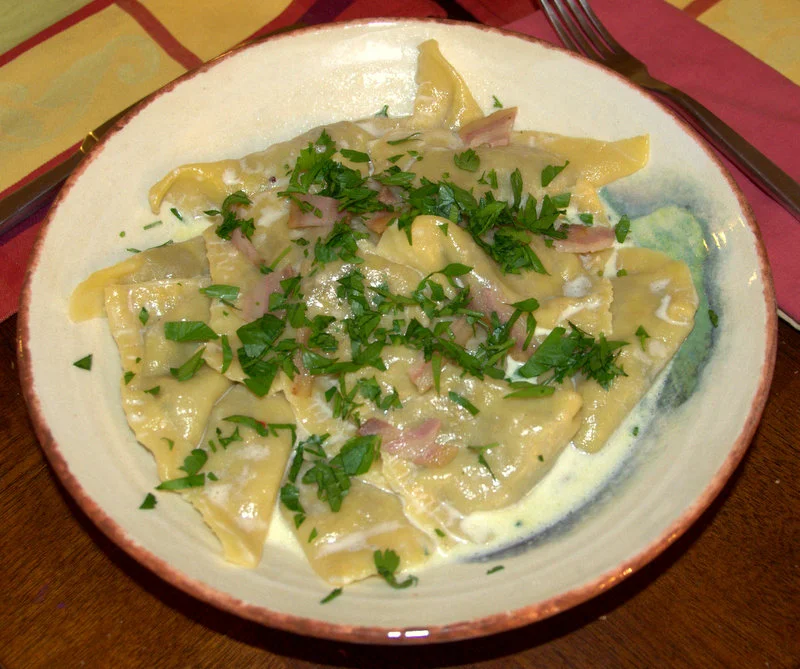 /Summary: This pasta dish was inspired by a meal I devoured in Florence, Italy. I don't actually recall what was in the ravioli there, but the creamy sauce flecked with speck (an Italian bacon) was out of this world. This is my homage to that.