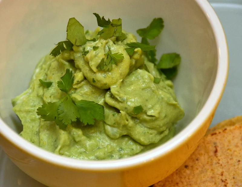 In a small (mini) food processor, put the crème fraîche, cilantro, avocado, lemon juice and salt. Process until you have a smooth puree. It will be a lovely color of green. Transfer to a small serving bowl and garnish with any extra cilantro leaves.