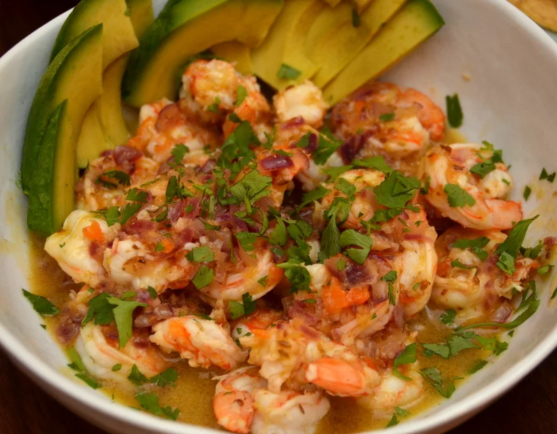 Set a cast iron skillet over medium-high heat, and when hot, pour in the shrimp and all the marinade. Stir frequently as the shrimp cook; you want them to cook evenly until just done. After 3-4 minutes, the shrimp should be a beautiful, bright orange and curled in as if they want to form circles. Using a slotted spoon, remove them to a serving bowl. Continue to cook the marinade until it is reduced into a nice sauce, roughly 5 minutes more. When that's done, spoon or pour it gently over the shrimp. Garnish with cilantro.