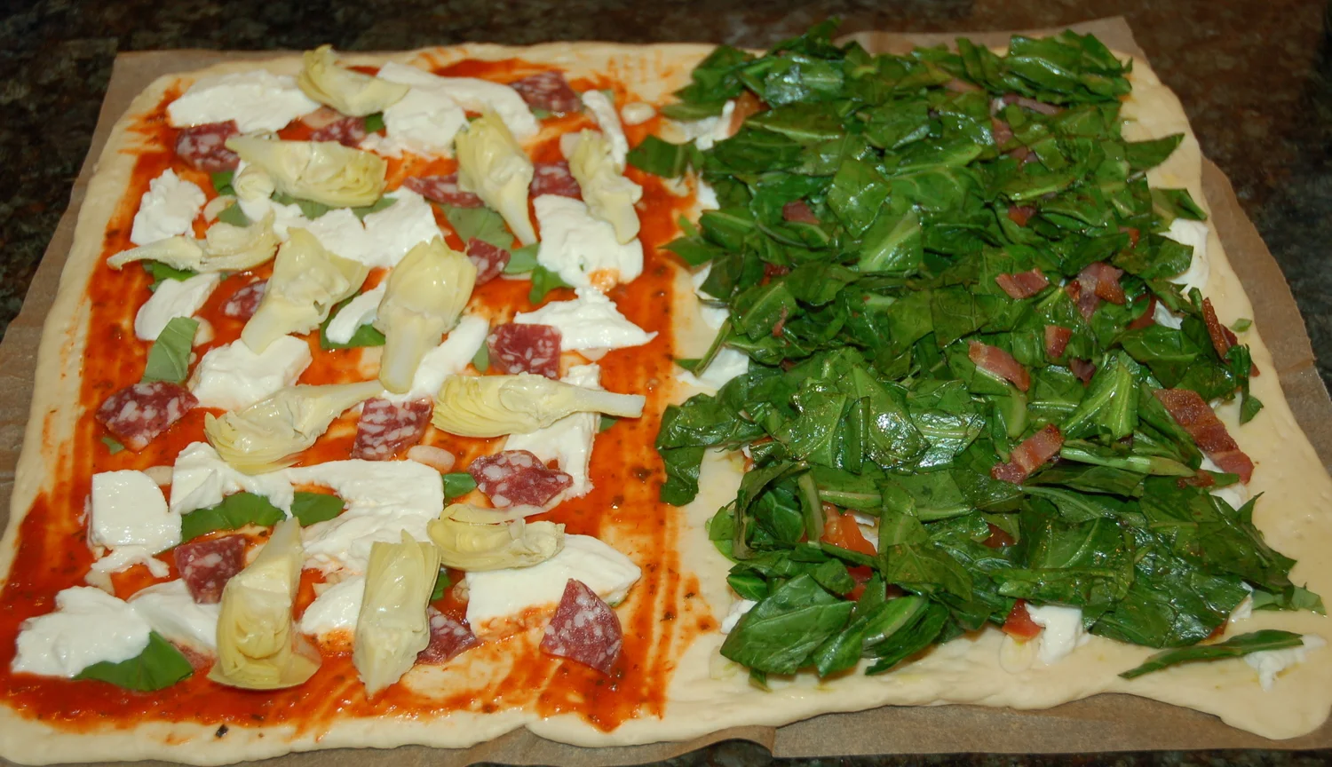 Makes half of an 11.5" x 17" pizza. This is the kind of dish that I would have been thrilled to order, eat and pay for in a restaurant. Quick-cooking the greens in a bit of the bacon drippings before putting them on the pizza keeps them moist and pretty on the hot grill or in the hot oven. If you can grill this pizza, the smokiness imparted in doing so is a great complement to the bacon on the pie. C'est bon? Oui!