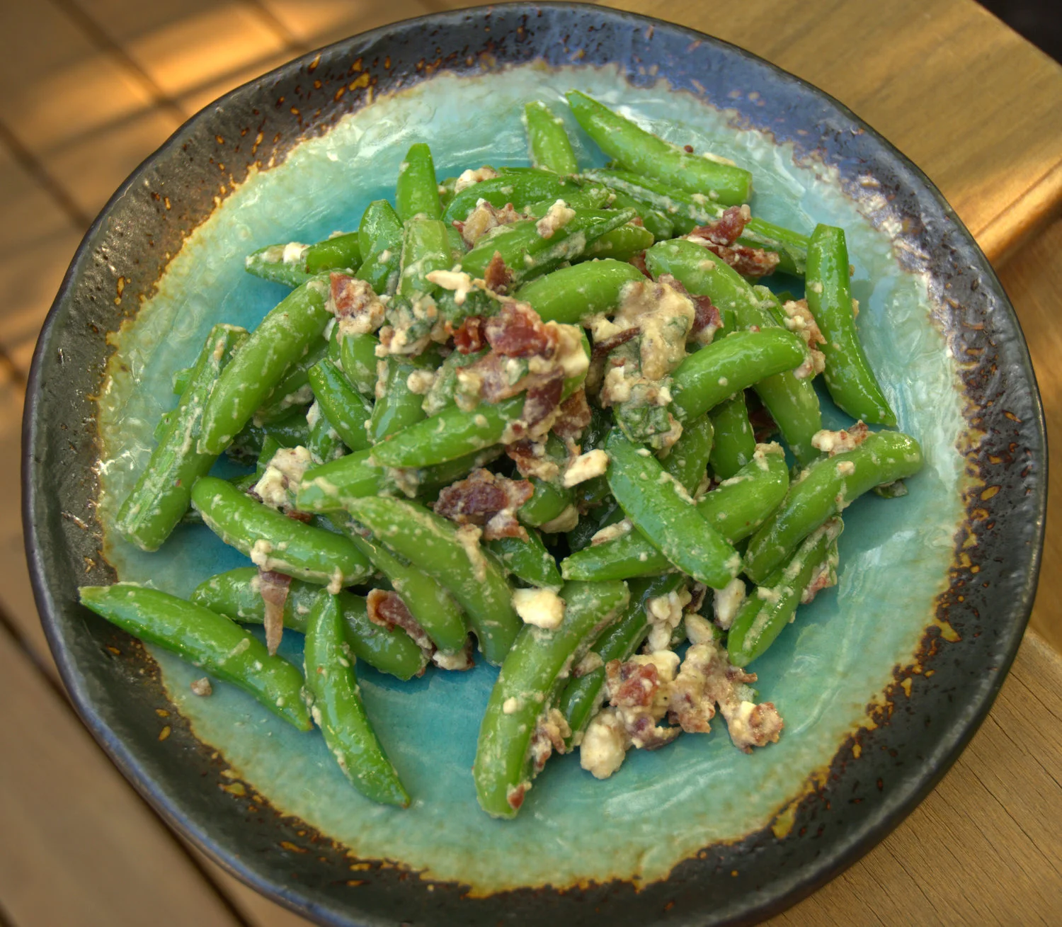 /Summary: Sugar snap peas make me happy. I love their bright hue and crisp crunch! The saltiness of bacon and feta in concert with the sweetness of maple and mint buttress the peas in every way. This is a wonderful summer salad- hearty, flavorful, all elements shine.