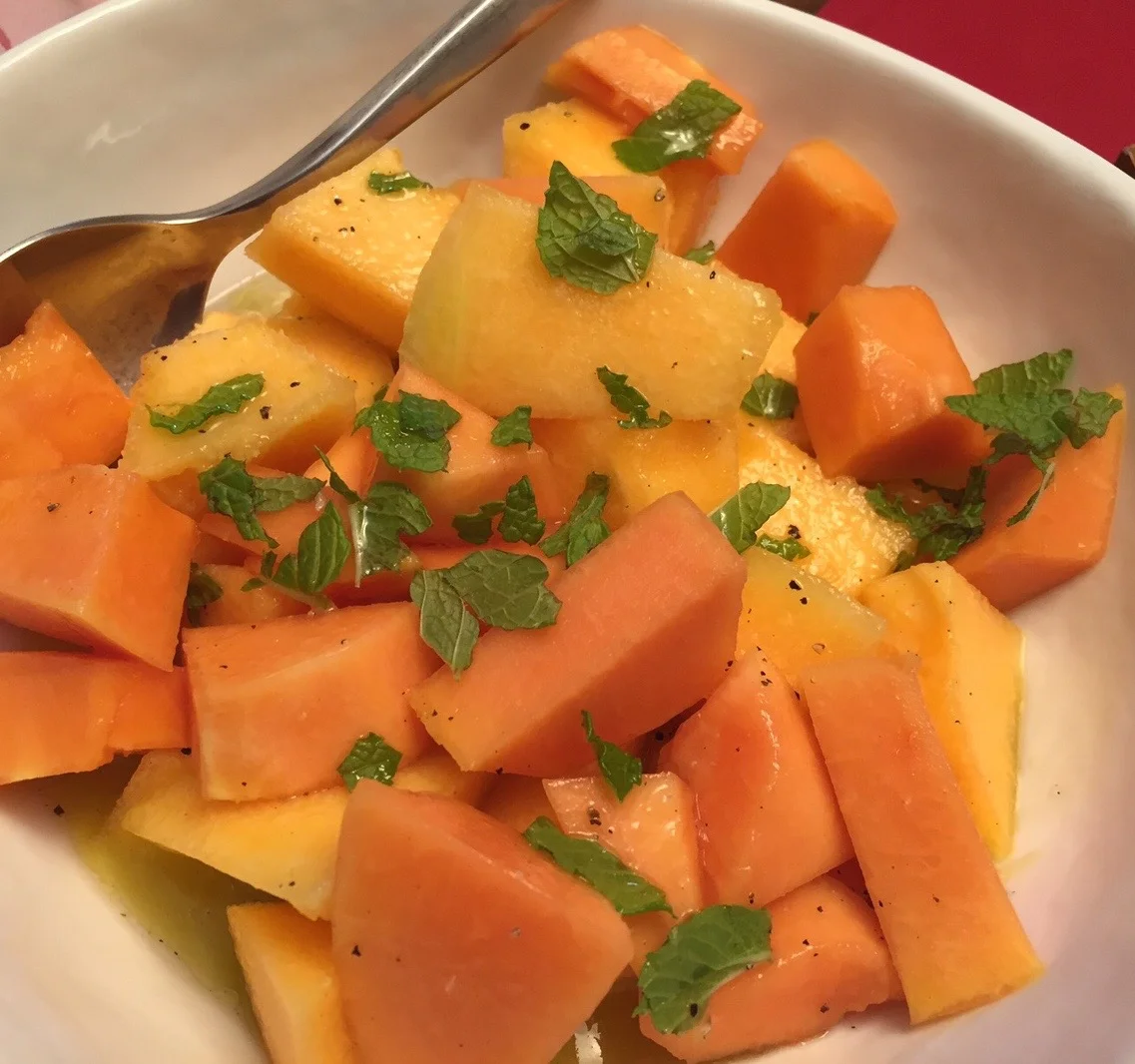 Gently toss the cantaloupe and papaya chunks together in a medium-sized serving bowl.
