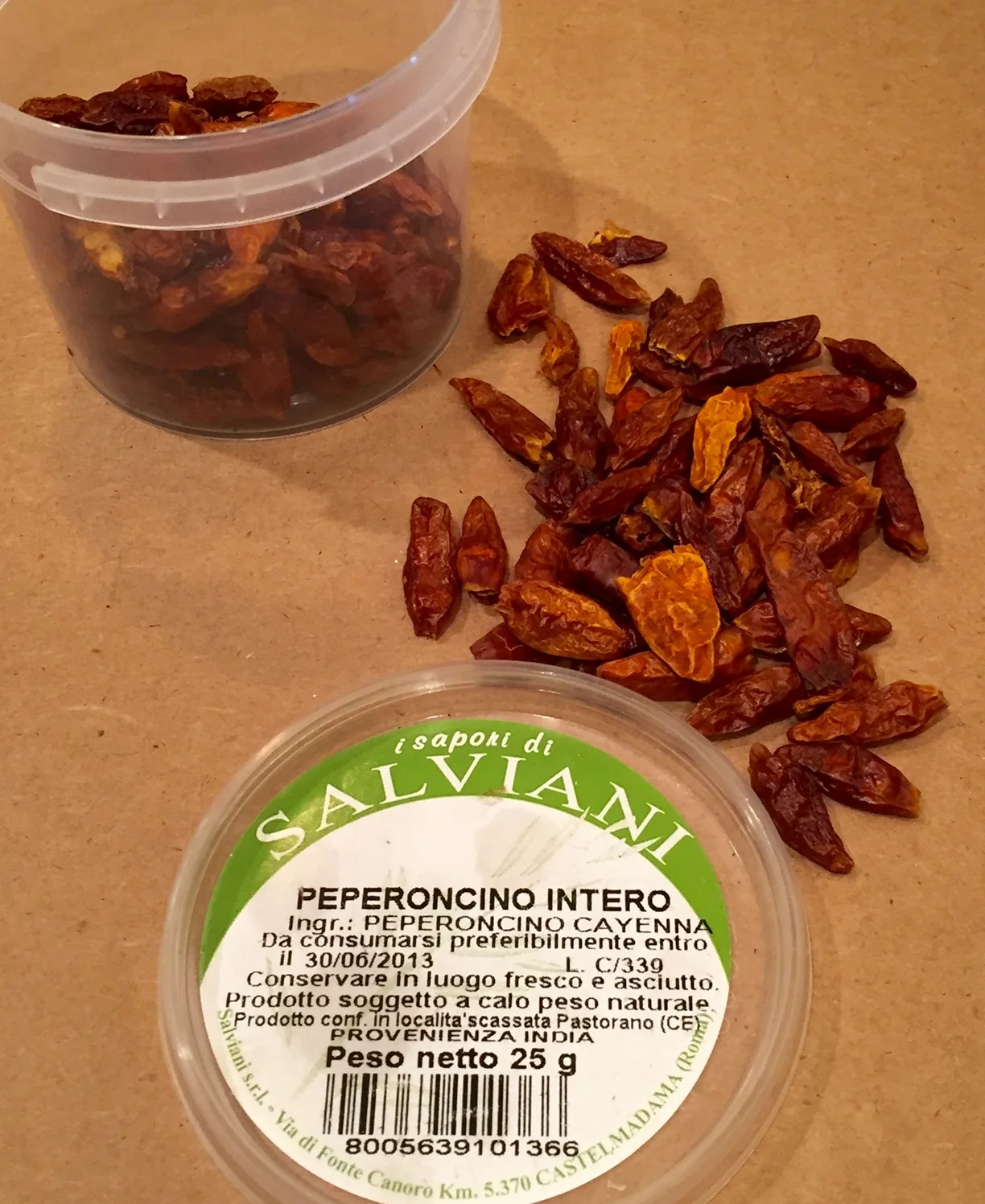 - 2 small dried peperoncino intero (whole; Italian hot chile pepper); I've included a picture below of the size ones I use; you can also substitute a generous pinch of crushed red pepper
